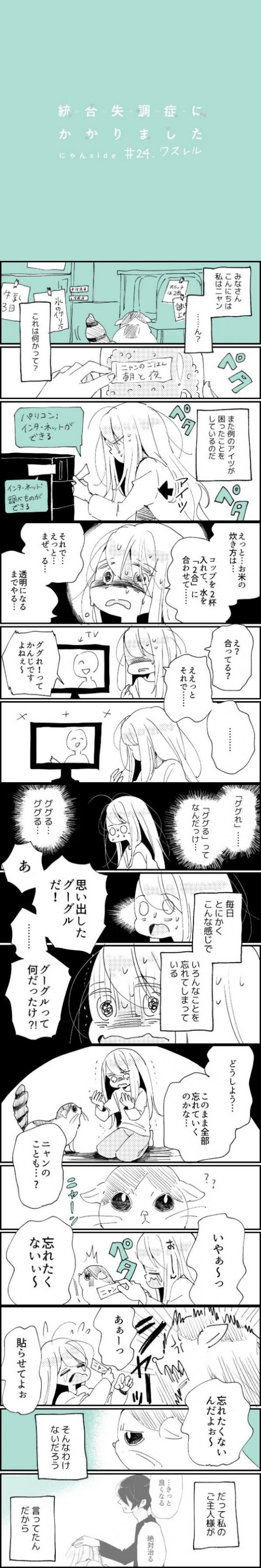 サイゾーウーマンカルチャーマンガさいこ『統合失調症にかかりました~にゃんside〜』【24話】忘却への抵抗 カルチャー 【エッセイマンガ】さいこ『統合失調症にかかりました〜ニャンサイド〜』 【エッセイマンガ】統合失調症にかかりました~にゃんside〜【24話・ワスレル】 2019/12/11 17:00 さいこ 統合失調症にかかりました〜にゃんside〜動物マンガさいこ サイゾーウーマンにて連載していた、自身の統合失調症の発症から社会復帰までを描いた闘病エッセイマンガ『統合失調症にかかりました』(著:さいこ)。今回、飼い猫の視点から病気を振り返る特別編がスタート。 猫から見た、人間の“生き辛さ”とは……。 【過去話はこちらから】 第24話 『ワスレル』 ©さいこ ー次回25話は12月18日(水)更新予定です。 【前作『統合失調症にかかりました』はこちらから】 自己紹介編 まとめ前編1~9話/まとめ後編10~18話 19話/20話/21話/22話/23話/24話/25話/26話/27話/28話/29話/30話/31話/32話/最終話 ※本作品は個人の経験に基づいたものです。統合失調症の症状もあくまでもその一部であり、絶対ではありません。個人差がありますことをご理解ください。 さいこ/@s_______ic インスタグラムにて、統合失調症にかかった自身の体験マンガを日々投稿。 https://www.instagram.com/s_______ic/ 最終更新:2019/12/11 17:00 焦れば焦るほど苛立つ 関連記事 【エッセイマンガ】統合失調症にかかりました~ニャンサイド〜【新連載】【エッセイマンガ】統合失調症にかかりました~ニャンサイド〜【2話・マエブレ】【エッセイマンガ】統合失調症にかかりました~にゃんside〜【3話・コメソウドウ】【エッセイマンガ】統合失調症にかかりました~にゃんside〜【4話・フテキゴウ】【エッセイマンガ】統合失調症にかかりました~にゃんside〜【5話・ザイタク】 その他の作品を読む 次の記事 NEWS・手越、『逃走中』スタッフを泣かせる!? >