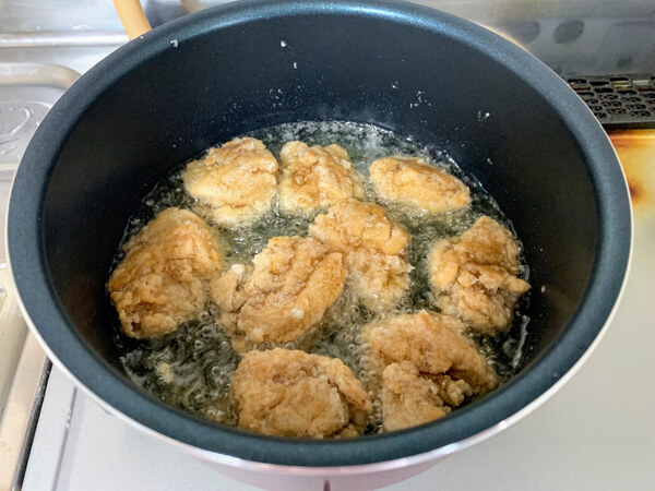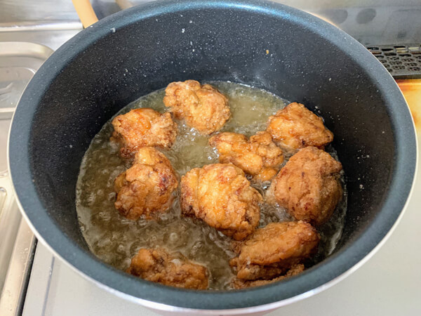 サイゾーウーマン暮らし食べ物バズレシピ【最強のソース唐揚げ】実践 暮らし 【あのツイッターレシピ、やってみました】 バズレシピ【最強のソース唐揚げ】はホントに最強!? 料理できない主婦が作ったら……簡単すぎてウマすぎて止まらない! 2020/04/04 17:00 アウちゃん(ライター) ツイッターレシピ、やってみました めっちゃ色が濃い! 常温で30分寝かせる 調味料にと鶏肉をつけこんで、よ〜く揉み込みます。リュウジさんはマヨネーズの塊がなくなるくらいよくモミモミする、と言っていたのでモミモミ……。なんかめっちゃ色が濃いんですけど……不安。ここから常温で30分寝かせることで、味を染み込ますようです。 寝かせました 片栗粉をしっかりつけて揚げていきます。片栗粉のほうが、揚げたときにざっくざっくになるそうです。知らなかった……。お弁当に入れるときは片栗粉と薄力粉を半々にするといいと、動画で親切に説明されていました。 さて1cmくらいの油の中に、鶏肉を入れて揚げていく。もう本当に揚げ物は長いこと旦那任せだったので、怖いったらありゃしない。でも油の量が少ないので気分的には「焼いてる」感覚になって不安は少なめ。 焼いてる感覚だから、揚げ物の怖さはない ウスターソースは高温だと焦げやすいとレシピにあったので、火加減に注意しながらずっとチェックを怠らない。意外にも不安になることなく、余裕を持ってできた。そして、こんな色になってきました。揚げてる間もウスターソースがまろやかになったような香りがしてきてたまらん……。 おいしそうな色になってきた 次のページ もう唐揚げ作るときは、この味付けが鉄板や! 前のページ123次のページ 関連記事 バズレシピ・リュウジさん【レンジ濃厚塩カルボ麺】、塩ラーメン&牛乳がまさかの“相性抜群”で最後の汁まで飲み干した!バズレシピ・リュウジさん「フライドエッグ丼」、目玉焼きだけで子どもに絶対「おかわり!!」言われるやつ!料理研究家・ぼくさん「フッカフカパンケーキ」、豆腐入りパンケーキに挑戦してみたら……めちゃめちゃ膨らむや〜ん!料理研究家・ぼく「ガリバタ塩辛焼きそば」、料理できない主婦が“旦那ウケ”最強レシピに出会ってしまった!バズレシピ・リュウジ「悪魔の焼き牛丼」を料理できない主婦が作ったら……“勝利の方程式”に子どもがおかわり!