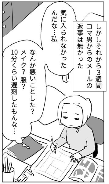 サイゾーウーマンカルチャーマンガ【マンガ】メールの返信がない! カルチャー 女の共感コミックサイト・ウーコミ! 【実話】34歳婚活男性「メールの返信がない」のは「お断り」? 3週間後に届いた“驚愕の内容”は 2020/04/17 18:00 ウーコミ!編集部 ウーコミ!マンガ婚活ウーコミ 「ついていけない…これがお見合いのテンポ!?」 レバ美は未婚の漫画家、34歳。ある日、妹から「お姉ちゃんの方が合いそう」とお見合い相手・コマ男を紹介される。「まずは一緒に住みませんか」の言葉に軽く承諾すると、トントン拍子に結婚話が進んでしまって!? 恋愛と条件、そして世間の“普通”に翻弄されるレバ美が、自身のお見合い体験を赤裸々に描くリアルエッセイ「お見合い結婚、恋してなくても幸せになれますか?」。 冒頭の1話目・エピソード4を無料で公開いたします。 レバ美/ウーコミ! ep.1-4……メールの返事がない! ――「お見合い結婚、恋してなくても幸せになれますか?」エピソード5は、来週金曜日に公開予定! ↓最新話はめちゃコミックで公開↓ 『お見合い結婚、恋してなくても幸せになれますか?』 ↓他の作品を無料でもっと読みたい方はコチラ↓ 女性の”共感”コミックサイト『ウーコミ!』 最終更新:2020/04/17 18:00 マイペースな人っているもんね 関連記事 【実話】婚活は「実家暮らしが払えばいい」!? 30代独身男性の“金銭感覚”に感じた衝撃【漫画・衝撃トラブル】参列者ドン引き……ダメンズ女が最後に選んだ衝撃の伴侶とは!?【日雇いマンガ】92話『完全防備! スッピン女子の通勤スタイル』 その他の作品を読む 次の記事 キスマイ・北山、大久保佳代子から酷評 >