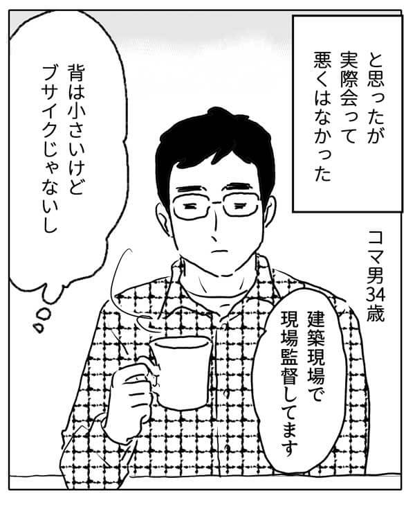 サイゾーウーマンカルチャーマンガ【マンガ】実家住みはオゴリが当然!? カルチャー 女の共感コミックサイト・ウーコミ! 【実話】婚活は「実家暮らしが払えばいい」!? 30代独身男性の“金銭感覚”に感じた衝撃 2020/04/10 18:00 ウーコミ!編集部 マンガ婚活ウーコミウーコミ! 「ついていけない…これがお見合いのテンポ!?」 レバ美は未婚の漫画家、34歳。ある日、妹から「お姉ちゃんの方が合いそう」とお見合い相手・コマ男を紹介される。「まずは一緒に住みませんか」の言葉に軽く承諾すると、トントン拍子に結婚話が進んでしまって!? 恋愛と条件、そして世間の“普通”に翻弄されるレバ美が、自身のお見合い体験を赤裸々に描くリアルエッセイ「お見合い結婚、恋してなくても幸せになれますか?」。 冒頭の1話目・エピソード3を無料で公開いたします。 レバ美/ウーコミ! ep.1-3…「お下がり男」とお見合いしてみたら ――「お見合い結婚、恋してなくても幸せになれますか?」エピソード4は、来週金曜日に公開予定! ↓最新話はめちゃコミックで公開↓ 『お見合い結婚、恋してなくても幸せになれますか?』 ↓他の作品を無料でもっと読みたい方はコチラ↓ 女性の”共感”コミックサイト『ウーコミ!』 最終更新:2020/04/10 18:00 オゴリはありがたく受ける派です 関連記事 【漫画・衝撃トラブル】参列者ドン引き……ダメンズ女が最後に選んだ衝撃の伴侶とは!?【実話】「AV女優に似てるね」空気が読めない34歳の婚活、その顛末は?「お見合い結婚」のリアル【日雇いマンガ】92話『完全防備! スッピン女子の通勤スタイル』 その他の作品を読む 次の記事 キンプリ・永瀬、山Pとなにがあった? >