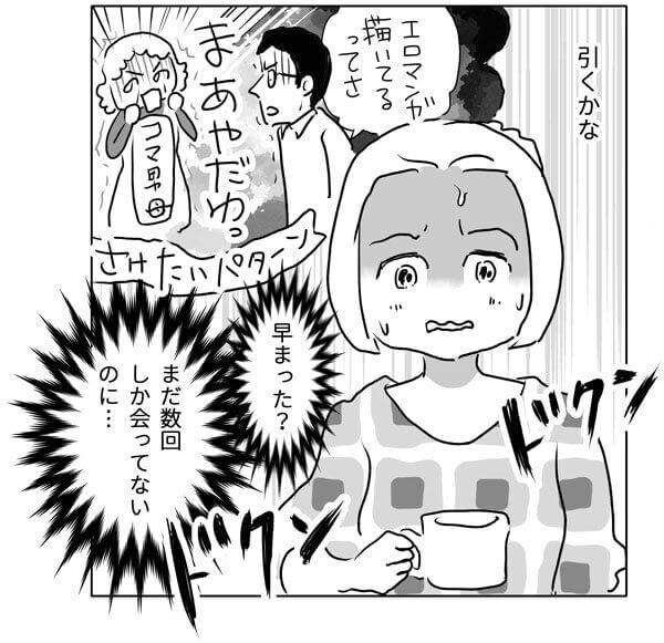サイゾーウーマンカルチャーマンガ【マンガ】親にも”内緒”な仕事 カルチャー 女の共感コミックサイト・ウーコミ! 【実話】「エッチな漫画を描いてます」親にも言えないアダルトな職業、婚活デートで明かすのはアリ? 2020/04/24 18:00 ウーコミ!編集部 ウーコミ!マンガ婚活ウーコミ 「ついていけない…これがお見合いのテンポ!?」 レバ美は未婚の漫画家、34歳。ある日、妹から「お姉ちゃんの方が合いそう」とお見合い相手・コマ男を紹介される。「まずは一緒に住みませんか」の言葉に軽く承諾すると、トントン拍子に結婚話が進んでしまって!? 恋愛と条件、そして世間の“普通”に翻弄されるレバ美が、自身のお見合い体験を赤裸々に描くリアルエッセイ「お見合い結婚、恋してなくても幸せになれますか?」。 冒頭の1話目・エピソード5を無料で公開いたします。 レバ美/ウーコミ! ep.1-5……親にも内緒の仕事 ――「お見合い結婚、恋してなくても幸せになれますか?」エピソード6は、来週金曜日に公開予定! ↓最新話はめちゃコミックで公開↓ 『お見合い結婚、恋してなくても幸せになれますか?』 ↓他の作品を無料でもっと読みたい方はコチラ↓ 女性の”共感”コミックサイト『ウーコミ!』 最終更新:2020/04/24 18:00 自分の仕事で引かれたらそれまでだわよ 関連記事 【実話】34歳婚活男性「メールの返信がない」のは「お断り」? 3週間後に届いた“驚愕の内容”は【日雇いマンガ】95話『NOバイキン! こまめな手洗い&除菌の思わぬ落とし穴とは』【漫画・衝撃トラブル】参列者ドン引き……ダメンズ女が最後に選んだ衝撃の伴侶とは!? その他の作品を読む 次の記事 ブルースが元妻・デミと隔離生活中 >