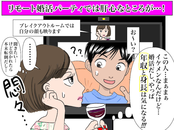 サイゾーウーマンカルチャー婚活ライターがリモート婚活に挑戦 カルチャー 婚活ライターが直撃♪ リモート婚活パーティ、やってみた! アラフォー婚活ライターがZoomで初潜入リポート 2020/06/02 20:30 白戸ミフル カルチャー (C)白戸ミフル コロナ禍が続く世の中、皆さまいかがお過ごしでしょうか? ついに緊急事態宣言も解除され、テンションが上がってきている婚活ライターの白戸ミフルです。緊急事態宣言から仕事がリモートとなったのはまだしも、合コンや他婚活の予定までもキャンセルが続き、絶望の淵に立たされていました。 がしかし! このご時世、リモート(オンライン)婚活パーティなるものが人気と聞きつけ、先日、早速参加してみたのですが、これが結構楽しかったのです♪ オンライン婚活パーティとは この度、私が参加したのは、株式会社いろものが運営する、スマホの結婚相談所「naco-do」が定期的に開催しているオンライン婚活パーティです。その名の通り、婚活パーティのオンライン版で、リモートワークにもよく使われているビデオ会議アプリのZoomを使って実施します。女性は980円(参加し放題プランだと1回185円〜)と手頃なのです。 毎週金・土の夜8時から開催されている、このオンライン婚活パーティですが、参加の流れは、運営者側から送られてくるZoomのリンク先に入る、たったそれだけ。先日、オンライン合コンの記事でも書かせていただきましたが、Zoomにはホスト(開催者)が参加者を選び、ツーショットにできる「ブレイクアウトルーム」という機能があるので、それを利用して、運営者側が参加者の男女でツーショットを作ってくれます。 それぞれツーショットでの会話を楽しんだ後、また相手を変えて、順々に参加者全員と会話を楽しみ、最後にマッチングしたい希望の相手を運営側に伝え、マッチングしたら、LINE等で連絡が取れるようになるという流れです。 イケメンとツーショットになったものの… これまで合コンやアプリ等、さまざまな婚活手段を試してきた筆者ですが、実は婚活パーティは初めてだったので、最初は少し緊張しました。午後8時の開始前に、運営者側からレクチャーの時間があり、簡単な操作方法を覚えたら、8時からツーショットスタートです。 最初の男性は、なかなかの爽やかイケメン公務員(36歳)でした。正直失礼ながら、イケメンはあまり期待していなかったこともあったので、緊張のボルテージが一気に高まり、アタフタしてしまう筆者、相手も初めての参加ということもあり、マゴマゴしている様子……。これはまずい! ツーショット時間は10分(参加人数により変動)しかないのにー! と、そこで筆者は、プロフィールカード(事前に情報を記載し、オンライン上で見れるプロフィールカードのURL)の存在を思い出し、相手に送って何とか会話をつなげようとしました! が、これが結果あまり良くなかったかもしれないなぁ……と今になって思っております。 というのも、そのプロフィールカードには職業・出身/居住地などだけではなく、年齢や身長・年収等も赤裸々に書かれています。全ての記載が必須ではないのかもしれませんが、私は全てバカ正直に記入したため、初対面の時にはオブラートに包むであろうセンシティブな情報を、初っ端から全てさらけ出してしまったのです……! しかも、相手はそのURLを持っていなかった(!?)ため、私のプロフィールカードを見ながら、真摯に自身のプロフィールも話してくれましたが、気になる年収と身長は開示されないままでした。ほかのオンライン婚活パーティのルールは知らないのですが、もしこの「naco-do」のサービスを使う場合は、プロフィールカードは相手が開示してから、自身も示すことを検討したほうが良いかと思われます。 少し悶々としつつも、誰にも邪魔されずにしっかりツーショットでトークができるのは、とても良いなと思いつつ、次の人へ。たまたま最初がイケメンだったから、無駄にハードルが上がってしまい、その後の男性を見る目がシビアになってしまうのは否めないですが、男性の年齢層は30代前半から40代後半と、アラフォーの筆者にとって、とてもシックリくるお年頃だったので、普通に世間話をするだけでも楽しめました。最終的には、プログラマー、音楽家、会社員、公務員×2名(参加男性の半分の3人が公務員でした)の合計6名の男性とお話をし、ドキドキのマッチングタイムです! 次のページ そして結果は……? 12次のページ 関連記事 「友達としては好きだけど、女として見られない」婚活女子を悩ます言葉を、プウ美ねえさんが斬る【実話】34歳婚活男性「メールの返信がない」のは「お断り」? 3週間後に届いた“驚愕の内容”は【実話】婚活は「実家暮らしが払えばいい」!? 30代独身男性の“金銭感覚”に感じた衝撃41歳独女、婚活をやめて「セブ島に英語留学」行ってみた! 3カ月の"ガチ目線”リポートニワカにはキツイ!? 33歳バンギャが「ヴィジュアル系婚活パーティ」に潜入!