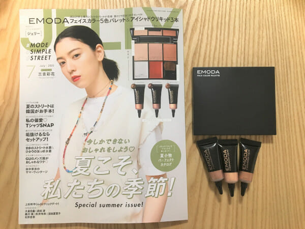 サイゾーウーマン暮らし100均・雑貨「JELLY」7月号付録レビュー 暮らし 【雑誌付録レビュー】 【雑誌付録レビュー】「JELLY」7月号、EMODAのフェイスカラー5色&アイシャドウ3色セットは満足度◎! 夏のツヤ肌メイクは完璧【女性誌】 2020/06/19 12:30 tukki(ライター) 雑誌付録(ふろく)レビュー いまや付録で雑誌を選ぶのは当たり前。毎月魅力的な付録が登場し、どれにしようか迷いますよね。そこで、付録を実際に手にして、見た目や使い勝手を徹底レビューします! 今日の付録:「JELLY」2020年7月号「 EMODAフェイスカラー5色パレット&アイシャドウリキッド3本」 お得度:★★★★★(5色パレットには大きめミラーとブラシ付き!) もっと使いたい度:★★★★★(この付録があればベースからアイシャドウ、ハイライトまで◎) おしゃれ度:★★★★★(夏らしいツヤメイクができちゃいます✰) 「JELLY」(文友舎)2020年7月号(C)サイゾーウーマン 「JELLY」(文友舎)2020年7月号の付録は、「EMODAフェイスカラー5色パレット&アイシャドウリキッド3本」! 前号同様、甘すぎないシンプルなデザインでおしゃれ女子に愛されているモード系アパレルブランド・EMODA(エモダ)とのコラボ付録で、ナチュラルなツヤ肌ベースが完成するパレットと、超万能な3カラーのアイシャドウリキッドがセットに。これがあれば、夏のツヤ肌メイクを存分に楽しめますよ! フェイスカラー5色パレットは、「JELLY」史上最大というだけあって、パレットのサイズは縦9.5××横11.5(cm)、リフィルの大きさは、縦4.2×横3.5(cm)とかなり大きめ。パレットの片側には大きなミラーが付いているのでとっても便利です。 フェイスカラー5色パレット(C)サイゾーウーマン また、雑誌の付録にしては珍しく、専用ブラシが付いているのもうれしいポイント。素材はナイロンで、柔らかい肌ざわりです。 ブラシはそのままパレットに収納できるため、かさばりません(C)サイゾーウーマン チューブタイプのアイシャドウリキッドは、先がかなり細いため、余分に取り出してしまうこともなく、量の微調整もしやそうです。 先が細く、使いやすそう(C)サイゾーウーマン 早速、パレット&アイシャドウ全8色をスウォッチ&色解説してみました! 次のページ 気になる色味は……? 12次のページ 関連記事 【付録レビュー】「美人百花」7月号、大ヒット付録“幸せを呼ぶ” Chestyスマホケースが再登場!【女性誌】【付録レビュー】「MonoMax」7月号、SHIPSコラボのコンパクト財布がスゴイ! 必ず欲しくなる「3大価値」とは?【情報誌】【付録レビュー】「InRed」7月号、ムーミンの収納ケース3点セットがコスパ&実用度◎! 部屋の小物を可愛く収納【女性誌】【付録レビュー】「サンキュ!」7月号、老後の「お金」を考える1冊! 今すぐやるべき5つのこととは?【女性誌】【付録レビュー】「小学一年生」7月号、巨大「チョコボール」登場!? 『ドラえもん』コミックスも付いて超豪華!【児童向け総合雑誌】