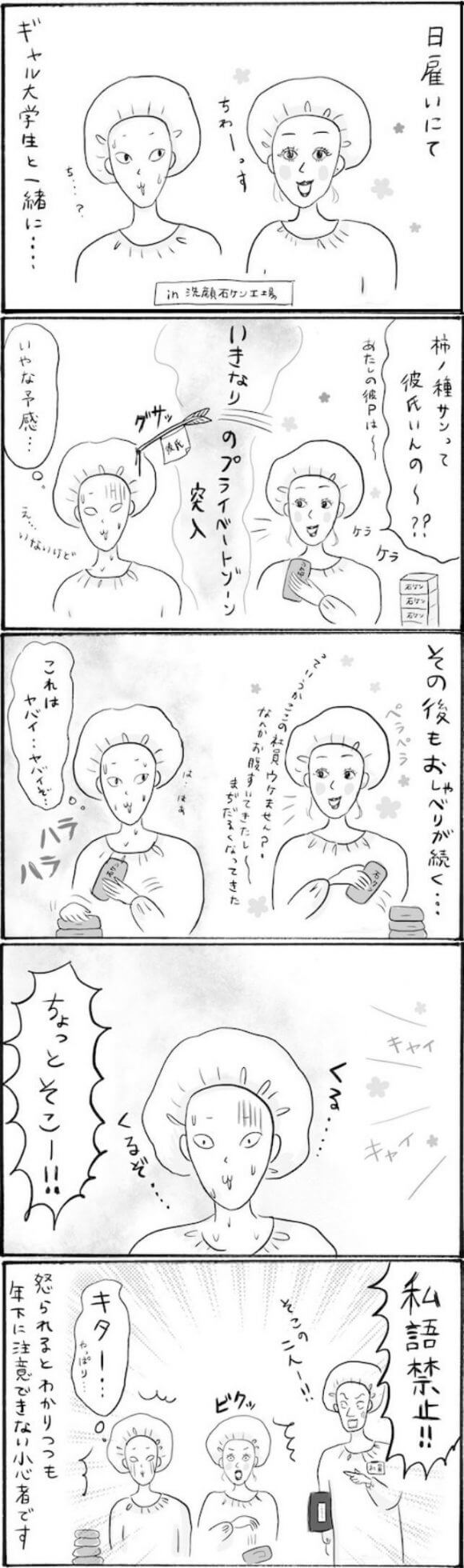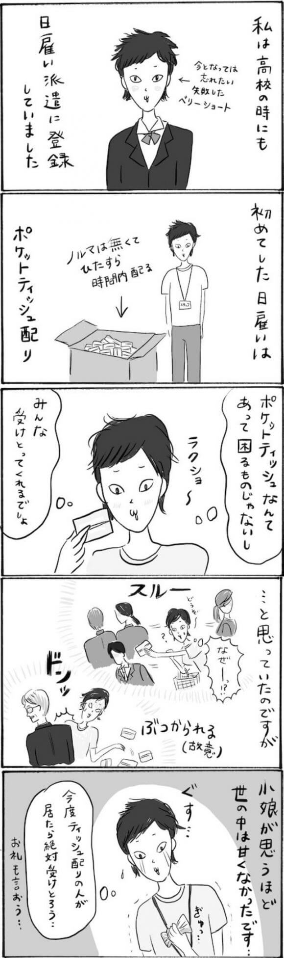 サイゾーウーマンカルチャーマンガ柿ノ種まきこ『アラサー独身女、今日も日雇いで生きてます』【日雇いマンガ】71〜77話 カルチャー 【連載】柿ノ種まきこ『アラサー独身女、今日も日雇いで生きてます』 【日雇いマンガ】『アラサー独身女、今日も日雇いで生きてます』【71~77話まとめ読み】 2020/07/24 13:00 柿ノ種まきこ(マンガ家) マンガ柿ノ種まき子日雇い 第75話『ギャル参戦! 止まらぬ仕事中のおしゃべりで巻き込み事故発生!?』 ©柿ノ種まきこ 明るいハツラツとした若者と一緒の現場になると、うれしい反面、ハラハラドキドキ……! 喝を入れられたあとはさすがにしょんぼりしていたギャルなのでした。 第76話『楽勝のつもりが……女子高生が日雇いでデビュー戦で受けた洗礼』 ©柿ノ種まきこ 高校時代、初めてしたバイトは日雇いでした。 いろいろな経験ができるので、働き始めにはとてもよかったですね。 ただ、ポケットティッシュ配りはまだ社会を知らない小娘にとってはなかなか心の折れる作業でした……。 次のページ 第77話『原宿系女子高生の日雇い体験記』 前のページ1234次のページ 関連記事 【日雇いマンガ】『アラサー独身女、今日も日雇いで生きてます』【36~42話まとめ読み】【日雇いマンガ】『アラサー独身女、今日も日雇いで生きてます』【29~35話まとめ読み】【日雇いマンガ】『アラサー独身女、今日も日雇いで生きてます』【22~28話まとめ読み】【日雇いマンガ】『アラサー独身女、今日も日雇いで生きてます』【15~21話まとめ読み】【日雇いマンガ】『アラサー独身女、今日も日雇いで生きてます』【8~14話まとめ読み】 その他の作品を読むバックナンバーを読む
