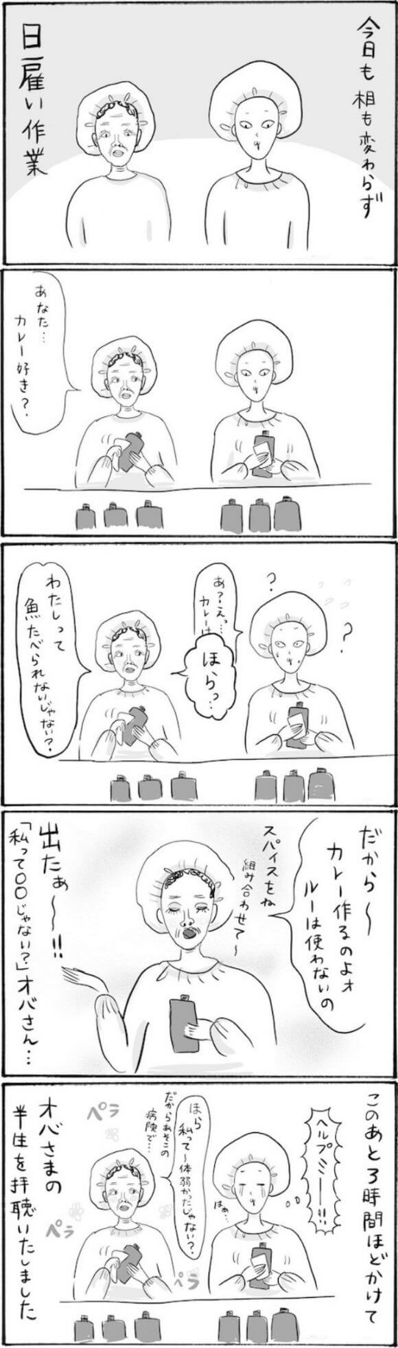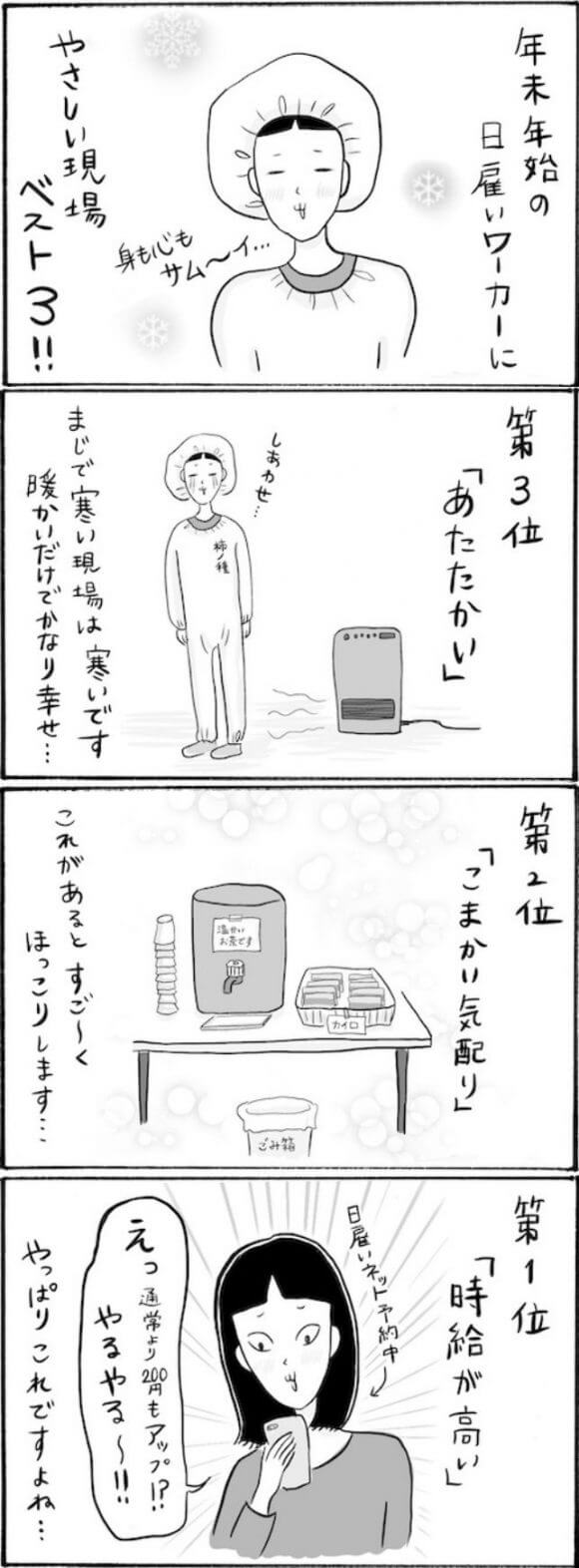 サイゾーウーマンカルチャーマンガ柿ノ種まきこ『アラサー独身女、今日も日雇いで生きてます』【日雇いマンガ】78〜84話 カルチャー 【連載】柿ノ種まきこ『アラサー独身女、今日も日雇いで生きてます』 【日雇いマンガ】『アラサー独身女、今日も日雇いで生きてます』【78~84話まとめ読み】 2020/07/24 13:01 柿ノ種まきこ(マンガ家) マンガ柿ノ種まき子日雇い 第82話『身も心もサム~イ! 独女にやさしい神現場ベスト3』 ©柿ノ種まきこ 年末年始の繁忙期は、世の人たちが華やかな時間を過ごしているだけに心が荒みがち……。 そんな中、優しい現場に出会えるとやる気もアップ~! 最後はやっぱりお金です……! 第83話『神出鬼没! 妖怪「私って○○じゃない?」オバさん』 ©柿ノ種まきこ 日雇いで隣になったり、ペアになったりする人って本当に重要……! 同じ作業でも1日の疲れがぜんっぜん違いますからね! この日は言わずもがな……帰るなり撃沈しました。 次のページ 第84話『倉庫でのアパレルピッキングで悪戦苦闘したワケ』 前のページ1234次のページ 関連記事 【日雇いマンガ】『アラサー独身女、今日も日雇いで生きてます』【36~42話まとめ読み】【日雇いマンガ】『アラサー独身女、今日も日雇いで生きてます』【29~35話まとめ読み】【日雇いマンガ】『アラサー独身女、今日も日雇いで生きてます』【22~28話まとめ読み】【日雇いマンガ】『アラサー独身女、今日も日雇いで生きてます』【15~21話まとめ読み】【日雇いマンガ】『アラサー独身女、今日も日雇いで生きてます』【8~14話まとめ読み】 その他の作品を読むバックナンバーを読む