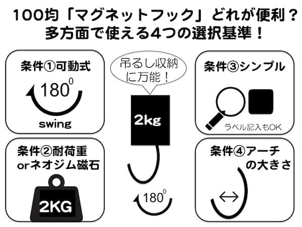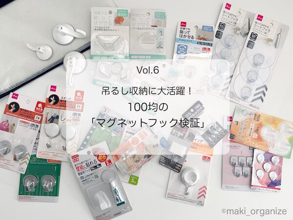 サイゾーウーマン暮らし住まい100均で買うべきフックベスト3 暮らし 伊藤まきの「お片付けSOS」相談! ダイソー・セリア・キャンドゥ・ワッツでプロが検証! 100均「マグネットフック」キッチン収納に使えるのはコレ 2020/07/20 19:30 伊藤まき(収納ライター) 100均「お片付け・お掃除SOS」伊藤まき 整理収納アドバイザー1級で収納ライターの伊藤まきが、家の中の “片付かない”ちょっとした悩みを“簡単で安く”解決するコツを提案します! (C)maki_organize 整理収納アドバイザーが「散らかる家」へ訪問するときに用意する「100均の収納グッズ」とは? 前回に続いて、「100均のフック」をテーマに、プロが愛用するアイテムとその活用実例をご紹介します。 筆者の道具バッグには、写真上の「100均フック」が常備してあります。「100均フック」は、ピン・粘着テープ・吸着シート・吸盤・熱圧着・マグネットなど種類が多いため、何を選べばよいか迷う人も多いでしょう。でも、プロが使うのは「6種類」だけなんです。 6種類目:「マグネットフック」 整理収納アドバイサーが愛用する「収納用フック」全6回シリーズのラストを飾るのは、100均の「マグネットフック」です。多種多様に揃いますが、収納で役立つフックは、図の「4つの条件」を持つアイテムだけ。その選択基準を満たすほど、多方面で「吊るす収納」に役立ちます。 (C)maki_organize 【1】フックがスイングする可動式 【2】耐荷重2kgまたはネオジム磁石構造 【3】デザインがシンプル 【4】アーチの大きさ これら条件を備えたマグネットフックを紹介していきます! ダイソーの「強力マグネットフック」 丸型の可動式フックは、他の100均にもあります(C)maki_organize 筆者調べによると、100均の「マグネットフック」の耐荷重は最大2kgまで。主に、ダイソー、セリア、キャンドゥ、ワッツなどでお求めになれます。特に、ダイソーの「強力マグネットフック」は4つの条件が揃う万能デザイン。 次のページ ワッツの「回転マグネットフック」 1234次のページ 関連記事 傘の「イラッ」を100均グッズでスッキリ解決! 収納のプロが教える、実例6パターン玄関の「イラッ」を100均グッズで解決! 「傘立て」「全身鏡」をセリア&ダイソーでスッキリ収納収納のプロが選んだ「100均グッズ」、ダイソー通称「スッポンフック」4つのスゴいポイント!SNSで人気爆発、セリア「100均フック」! プロも大絶賛「フィルムリングフック」4つの魅力収納のプロが選ぶ「100均ファイルボックス」はコレ! キャンドゥ「スッキリまとめ隊」の使い方実例