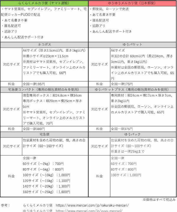 サイゾーウーマンコラム「メルカリ便」の違いを解説! コラム 【連載】“買い物狂い” の散財日記<番外編> メルカリ初心者必見! 「らくらくメルカリ便」と「ゆうゆうメルカリ便」の違いを買い物狂いが解説 2020/07/29 21:00 千葉N子(ライター) “買い物狂い” の散財日記 初心者はコンビニで梱包資材を買うのがグッド! ※クリックで拡大表示(C)千葉N子 アイシャドウやアイライナーなどの化粧品や本などを送る場合は、「ネコポス」(ヤマト)か「ゆうパケット」(郵便局)がおすすめです。 メルカリ便の資材は、オンライン上のメルカリストアほか、全国のセブン-イレブン、ファミリーマート、ローソンでも取り扱われています(一部の地域・店舗では取り扱いをしていない場合も)。購入したらあとは商品を入れて、そのままレジで発送手続きを済ませるだけとラクチン。ゆうパケットはネコポスよりも20円ほど発送料金が安くなっているため、ローソンが近くにある人は、ゆうパケットを選択することをおすすめします。なお、発送の際は、商品をビニール袋に入れたり、緩衝材で包んであげると、配送時の破損防止になるため安心です(資材は100円ショップなどでも購入可能です)。 また、60サイズ(梱包した後の宅配物のサイズが縦・横・高さ合わせて60cm以下)ほどの大きさはいらないけど、高さのある小物を送りたいというときには「宅急便コンパクト」がおすすめです。こちらはセブン-イレブンやファミリーマートで専用の箱を購入でき(税込み70円)、そのまま発送することが可能です。 ゆうゆうメルカリ便のゆうパケットプラスで送った場合は、全国一律375円(税込み)。らくらくメルカリ便の宅急便コンパクトは全国一律380円(税込み)です。追跡アリ、補償アリの配送サービスとしてはこれほど低価格で優秀なモノはないのでは!? と思います。普段もこのサービスを使いたいと思うのですが、ゆうパケットプラスと宅急便コンパクトは、メルカリ専用のサービスのため、メルカリ利用時しか使用できません。 専用資材がコンビニで買えることはわかったけど……肝心の出し方がわからない! という方は、出品する際にとりあえず「メルカリ便」を選択して、商品が売れたら緩衝材で梱包してコンビニに持ちこみ、店員さんに「これを宅急便コンパクト/ゆうパケットで出したいんですけど」などとスマホを出しながら聞いてみてください。バーコードを読み取って、あっという間に発送が完了しますよ! メルカリは一度使ってしまえば、すぐに慣れます! 手始めにメイクボックスの中から使わないコスメを出品してみてはいかがでしょうか。人気のブランドのものなら、使いかけでもあっという間に売れてしまいます。ゆうパケットのダンボール箱に入れて、さっと送ってお小遣いをゲット。それに慣れたら、徐々に大物にトライすると良いと思います! 皆さんのメルカリライフを応援いたします! 前のページ12 千葉N子(ライター) 1,000万円以上の貯金があったにもかかわらず、買い物沼に踏み込み、現在アラフォー貯金0円(むしろマイナス)。毎月、27日に引き落とされるカード利用料に震えながら、今日も元気に散財している。著書に『“買い物狂い”の散財日記: 千葉N子のリアルな家計簿大公開』がある。 X:@chibaenuco 買い物してみた@千葉N子 最終更新:2020/07/29 22:09 気軽にチャレンジ! 関連記事 「手持ち2万」「カード破産」で諦めた6万円のジャケットが忘れられず……4カ月後に運命の再会も、美化された記憶にガッカリしたワケ3万円が一瞬で水の泡に……婚活アプリでモテ期到来も、せっかくのデート服が「ボロ雑巾」と化す!?メルカリの「発送方法」を見落として大失敗!? 商品の「梱包」で損をしないためのコツメルカリで購入後に「動作不良」トラブル発覚! 事務局に怒りの問い合わせも、“補償”が下りず、泣き寝入りメルカリで電化製品を買ってはいけないワケ――「商品名」「付属品の有無」購入時に気を付けたい4つのポイント! 次の記事 ジャニーズ「ドリアイ」配信でトラブル連発 >