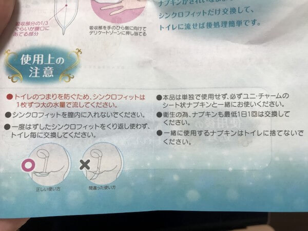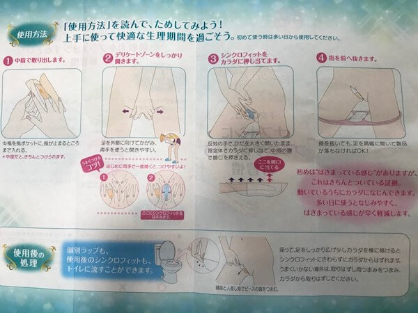 サイゾーウーマン暮らし100均・雑貨トイレに流せる生理用品「シンクロフィット」 暮らし トレンド商品ガチレビュー トイレに流せる“挟む生理用品”「シンクロフィット」レビュー! 月経3日目まで使ってみた【長所・短所・注意点】 2020/09/06 18:00 アウちゃん(ライター) トレンド 指にはめてみてわかった。厚さはナプキンと同等 個別ラップを外します。シンクロフィット本体は、ポケットのような構造になっているので、説明書通りにポケットへ指をはめてみました。 第二関節まですっぽり入る(C)サイゾーウーマン 指をはめてみてわかりました。シンクロフィットの厚さは、普通の量の時に使うナプキンと同じくらい。 実際に使うときは、手首をくいっと曲げて、この状態でお股に挟むようです(本当は中指の方がいいようです)。 この形でお股に装着します(C)サイゾーウーマン シンクロフィットには詳しい説明書も付いているので、初めてでも安心して使うことができます(ちょっと説明イラストが照れくさい……)。 個別ラップもシンクロフィット本体もトイレに流せるのがうれしい(C)サイゾーウーマン 「使用上の注意」をチェックすると、「間違った使い方」の欄に、シンクロフィットそのままタンポンのように使ってる画像がある……。そんな人おらんやろう、これは痛くてさすがに気がつくはず……。と思いながらも、しっかり説明書を読みました。一度外したシンクロフィットは繰り返し使わない・ナプキンも最低1日一回は交換しましょうと書かれている。衛生面を考えた上でとても大切なことだ。 個別ラップもシンクロフィット本体も使用後はトイレに流せるのがうれしい。 注意事項にしっかり目を通しました(C)サイゾーウーマン ほかにも説明書でポイントだと思ったのは、この2点です。 ・座って足をしっかり広げ少し体を傾けるとシンクロフィットが体から離れる。うまくいかないときでも、ツマミがついているのでそれを引っ張ってトイレに流せばOK! ・初めは体が慣れなくても2~3個使うと上手に使えるようになってきて、動いてるうちに体に馴染む 早速、生理初日から3日目まで使ってみました! 次のページ シンクロフィット実際に使ってみた! 2日目のドロッも不快感ナシ 前のページ123次のページ 関連記事 ナプキンがいらない生理用ショーツ「ムーンパンツ」検証レビュー! 生理1週間、毎日穿いてみた結果……?【長所・短所・注意点】【マンガ】生理中の気分転換は「ベッドの中でもできること」!【第79回】【マンガ】生理前の「ネガティブ期」……SNSとはどう付き合うのが正解?【第78回】生理前の頭痛はPMSではない!? 頭痛専門医が教える、「女と片頭痛」の意外な事実!生理痛は本来「ない」のが正常 子宮内膜症のリスクが高まる痛みは漢方で改善