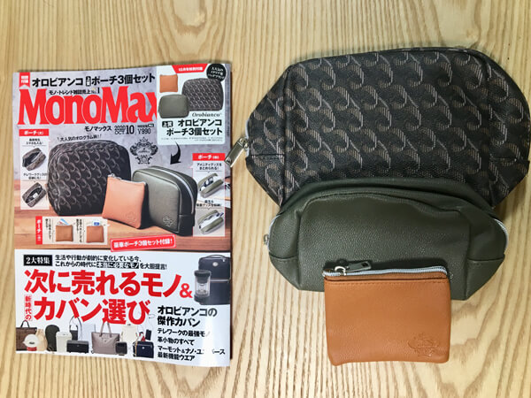 【付録レビュー】「MonoMax」10月号、オロビアンコのポーチ3個セットが高級感たっぷり! 性別問わずあらゆるシーンで大活躍【情報誌】