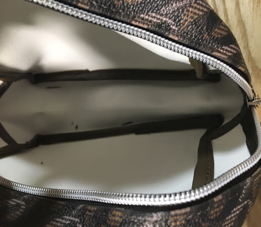 ポーチの内側は白く、特にポケットなどは付いていません。ポーチの中に素材の切れ端が落ちていましたが、縫製は丁寧で綺麗な仕上がりでした。