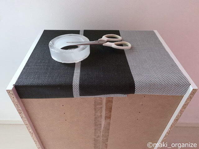 ダイソーの「テーブルランナー」(W25☓H120cm)は、カラボ(約W42×D30×H88cm)を隠すのに、ぴったりのサイズ。写真上のように、2枚を重ね合わせてカラボの背板に貼り付けるだけ。