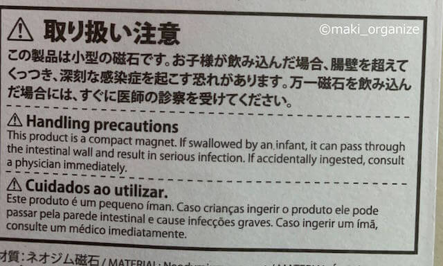 サイゾーウーマン暮らし住まいダイソー強力マグネットで壁面収納 暮らし 伊藤まきの「お片付けSOS」相談! ダイソーなら激安で再現可能! 収納のプロが伝授、“100均マグネット”を使った壁面収納術 2020/10/08 19:30 伊藤まき(収納ライター) 「お片付け・お掃除SOS」伊藤まき 赤ちゃんやペットのいる家では「注意」が必要! 読むだけで震える注意書きですね……(C)maki_organize ダイソーの「超強力マグネット」裏面には、写真上のような注意書きがあります。注意とありますが、小さな子どもやペットと暮らす家では、使用しないほうが無難です。ラムネより小さなサイズなので、散らかる家で見落とすと危険です。 ほかにも注意点があるため、セリアとダイソーの裏面に記載されている注意書きをまとめました。 (C)maki_organize 「ネオジム磁石」は、amazonでも人気の商品ですが取り扱いについてはどれもデリケートな内容を持ちます。注意喚起が必要なほど、強力だともいえます。 ではさっそく、使用例と実際の収納例の紹介です。 次のページ :使用方法1:ティッシュケースにマグネットを付ける 前のページ12345次のページ 関連記事 ダイソー&セリアのコレが正解! 収納のプロが指名買い「ホッピングバッグ」5つの魅力ダイソーの名品が「じゃない使い方」で大活躍! カラボの“生活臭”を3秒で目隠し……どころか“高見え”!ダイソー「ソフトバスケット」、仏ブランドにそっくり! カラボの横置き収納を“オシャレ”に解決冷蔵室の卵ケースは使わない! 収納のプロが選ぶ、100均の2アイテムだけで「冷蔵庫」スッキリ整理セリアの人気「プラダン」で、無印良品いらずの“裏ワザ”! 100均グッズでできる5つのこと