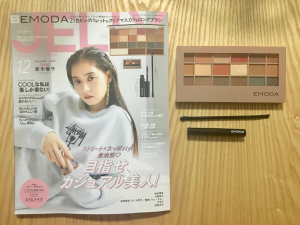 サイゾーウーマン暮らし100均・雑貨「JELLY」12月号付録レビュー 暮らし 【雑誌付録レビュー】 【付録レビュー】「JELLY」12月号、SNSで「コスパ神」と話題! EMODA21色パレットがアイメイクに超使える【女性誌】 2020/10/21 15:18 tukki(ライター) 雑誌付録(ふろく)レビュー いまや付録で雑誌を選ぶのは当たり前。毎月魅力的な付録が登場し、どれにしようか迷いますよね。そこで、付録を実際に手にして、見た目や使い勝手を徹底レビューします! 今月の付録:「JELLY」2020年12月号「 SNSで話題!コスパ最高なアイメイク超特化セット!EMODA21色ビッグパレット&クリアマスカラ&ロングブラシ 」 お得度:★★★★★(950円で21色ビッグパレット、クリアマスカラ、ブラシはお得すぎる!) もっと使いたい度:★★★★★(アイメイクのパターンは無限大、どんなアイメイクにも◎) おしゃれ度:★★★★★(色展開がこれからの季節にぴったり♪) 「JELLY」(文友舎)2020年12月号(C)サイゾーウーマン 「JELLY」(文友舎)2020年12月号の付録は、以下の3点です。 ・EMODA21色ビッグパレット ・クリアマスカラ ・アイメイク用ロングブラシ 今回の付録は、前号同様、甘すぎないシンプルなデザインが人気のモード系アパレルブランド・EMODAとのコラボアイテム。アイカラー21色のビッグパレット、クリアマスカラ&アイメイク用ロングブラシという、マスクが手放せない今だからこそ華やかに見せたい“アイメイク”に重点を置いた超豪華付録です! Twitter上でも、「JELLYの付録、めっちゃイイ!」「ブルべな私でも使いやすい♪」「色ド好みだし絶対使いやすいし……コスパ神か?」「こんなに付いてて良いんですか!?」と大好評でした。 まずは、21色ビッグパレットから詳しく見ていきましょう! EMODA21色ビッグパレット(C)サイゾーウーマン 次のページ 圧巻のビッグパレット全21色、スウォッチ&色解説しました! 123次のページ 関連記事 【付録レビュー】「MonoMax」11月号、ナノ・ユニバース長財布が機能的! 36枚のカード収納で中身スッキリ【情報誌】【付録レビュー】「LEE」11月号、『鬼滅の刃』一筆箋に「可愛すぎて使えない」「飾っておきたい」とファン大興奮!【女性誌】【付録レビュー】「InRed」11月号、スヌーピーの3wayエコバッグが機能性抜群! 買い物に大活躍!?【女性誌】【付録レビュー】「サンキュ!」11月号、大人気「1000万円貯まる手帳」再登場! 進化した内容とポイントをチェック【女性誌】【付録レビュー】SNSで話題沸騰! 「小学一年生」11月号、ドラえもんの「アンキパンメーカー」で子どもの学力アップ!?【児童向け総合雑誌】