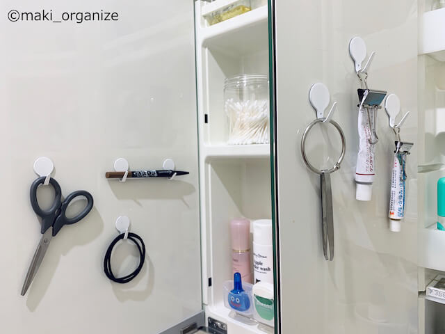 サイゾーウーマン暮らし住まい洗面台の鏡裏の収納術7つ 暮らし 伊藤まきの「お片付けSOS」相談! 収納のプロが10年試した、100均グッズ「決定版」! 使いにくい「洗面台の鏡裏」スッキリ片付く7アイテム 2020/11/23 19:30 伊藤まき(収納ライター) 「お片付け・お掃除SOS」伊藤まき [5]セリア「ミニフック」で吊るす・浮かす収納 先端の角度を変えられるのが最大のポイント セリアの「ミニフック」です。フックの先端が長く、加工しやすいので小物収納に最適です。これを扉裏に貼りました。 片付けの作業でもヘビロテアイテムです 埋もれがちな、塗り薬、グルーミング、ヘアゴムなども家族みんなが手に取りやすくなりました。 セリアの「ミニフック」はカミソリにもぴったり 棚の内側や、付属の可変トレイに付けてもOK! ダブルクリップを使えば、歯磨き粉のかける収納にも◎ 。吊るす収納、浮かす収納にも万能です。 次のページ [6・7]100均の「ミニポケット」+セリアの「ティッシュケース」で奥行フル活用 前のページ1234567次のページ 関連記事 100均「魔法のテープ」で壁面ラックが作れる! キャスター付き収納ケースなど6つの作り方実例ダイソーなら予算10分の1でOK!? 収納のプロが体当たりレポート、「魔法のテープ」不要でここまでできるセリア「キッチンワイヤー」グッズが大活躍! 100円で傘もスリッパも洋服も片付く8つの収納実例ダイソーの入手困難「シューズケース」、収納のプロも愛用! 万能すぎる使用実例8パターンセリアのアレを「じゃない使い方」する“必見テク”! 洋服収納をスッキリ、オシャレに解決