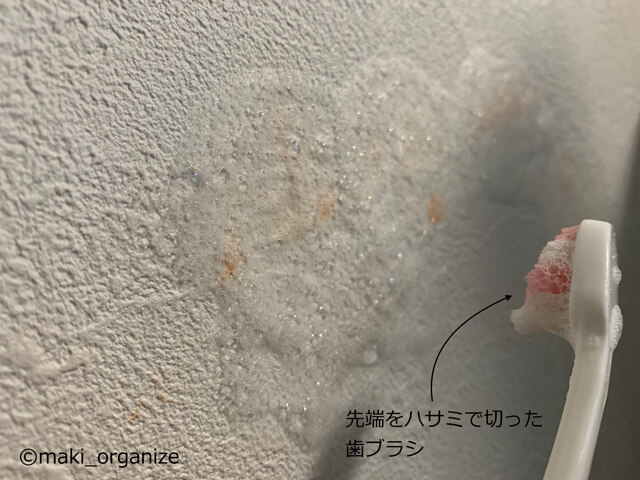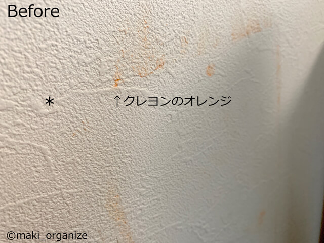 サイゾーウーマン暮らし住まいウタマロクリーナーで実例ビフォー・アフター! 5年放置した壁の「手アカ・黒ずみ・クレヨン・油」が激落ち! 暮らし 伊藤まきの「お片付けSOS」相談! ウタマロクリーナーで実例ビフォー・アフター! 5年放置した壁の「手アカ・黒ずみ・クレヨン・油」が激落ち! 2020/12/11 16:30 伊藤まき(収納ライター) 「お片付け・お掃除SOS」伊藤まき 実例2[Before]クレヨンの跡 2つめは「クレヨンの跡」を[実例1]と同じ道具と手順で消します。 あらゆる洗剤で試しても落ちなかったそう(C)maki_organize Aさん宅の子どもが壁に描いた、オレンジ色の「クレヨンの跡」です。「ネットの情報を集めて、頑張って消したけれどまだ残っていて……」とお悩みでした。 [After] 汚れていた場所を見失うほど!(C)maki_organize 掃除の手順はこちら。順を追って説明していきます。 [掃除の手順01]ウタマロクリーナー+歯ブラシ この歯ブラシも、良い仕事をします(C)maki_organize こちらも、[実例1]と同じ手順で「ウタマロクリーナー」の泡を歯ブラシで立てながら素早く消していきます。色が伸びないよう、「魔法のタオル」で素早く汚水を拭い取ります。 [完成!] 子どもの「壁の落書き」も怖くない!?(C)maki_organize 簡単に「クレヨンの跡」が消えました。「ウタマロクリーナー」のしっかりした泡で、汚れが浮き出た結果です。壁がワントーン明るくなりました。 次のページ 実例3[Before]キッチンの「油の飛び散り」 前のページ12345678次のページ 関連記事 プロに学んだ大人気「ウタマロクリーナー」の5つの使い方! オキシクリーンも重曹もいらない大掃除テクニックを伝授キャンドゥ・ダイソー・IKEAの“買い”アイテム6選! 収納のプロがオススメ「洗濯ネット」活用術 収納のプロが10年試した、100均グッズ「決定版」! 使いにくい「洗面台の鏡裏」スッキリ片付く7アイテムダイソーなら予算10分の1でOK!? 収納のプロが体当たりレポート、「魔法のテープ」不要でここまでできるダイソーのコレ必見! ヒートテック・モコモコ靴下もスッキリ収納、冬のイライラ解決アイテム