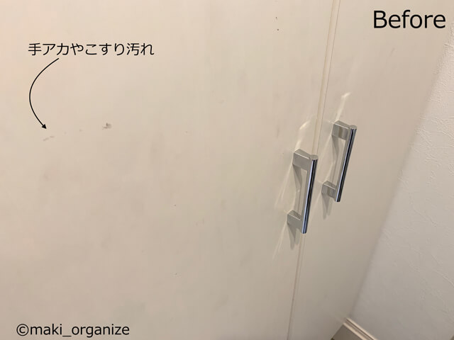 サイゾーウーマン暮らし住まいウタマロクリーナーで実例ビフォー・アフター! 5年放置した壁の「手アカ・黒ずみ・クレヨン・油」が激落ち! 暮らし 伊藤まきの「お片付けSOS」相談! ウタマロクリーナーで実例ビフォー・アフター! 5年放置した壁の「手アカ・黒ずみ・クレヨン・油」が激落ち! 2020/12/11 16:30 伊藤まき(収納ライター) 「お片付け・お掃除SOS」伊藤まき 実例5[Before]玄関の下駄箱 次の掃除は、ウタマロクリーナーとメラミンスポンジを使います。 2020年は、手が触れる場所を念入りに!(C)maki_organize Aさん宅の玄関にある、下駄箱です。取っ手には手アカ、何かの擦り傷汚らしきものもあります。全体的に黒ずんでいたので「魔法のタオル」で水拭きをしてから、「ウタマロクリーナー」と「メラミンスポンジ」で表面をこすります。 [After] 下駄箱の中や玄関ドアまで、「ウタマロ」1本(C)maki_organize 汚れを落としたら、「ウタマロクリーナー」を薄めたお湯に「魔法のタオル」を浸して全体を拭き上げます。全体のくすみも一掃して、取っ手の輝きも復活。汚れを落とすだけじゃなく、輝きも取り戻せます。 [ポイント]「手アカ」を落とすなら、メラミンスポンジ! タオルは汚れ落とし用と仕上げ用の2枚(C)maki_organize キッチンの引き出しや扉、玄関の扉、部屋のドア、トイレのドアなど一般的な住宅では「化粧板」が多く採用されています。人気のカラーボックスも同じです。この汚れには、メラミンスポンジが正解。 次のページ 実例6[Before]化粧板の汚れ 前のページ12345678次のページ 関連記事 プロに学んだ大人気「ウタマロクリーナー」の5つの使い方! オキシクリーンも重曹もいらない大掃除テクニックを伝授キャンドゥ・ダイソー・IKEAの“買い”アイテム6選! 収納のプロがオススメ「洗濯ネット」活用術 収納のプロが10年試した、100均グッズ「決定版」! 使いにくい「洗面台の鏡裏」スッキリ片付く7アイテムダイソーなら予算10分の1でOK!? 収納のプロが体当たりレポート、「魔法のテープ」不要でここまでできるダイソーのコレ必見! ヒートテック・モコモコ靴下もスッキリ収納、冬のイライラ解決アイテム