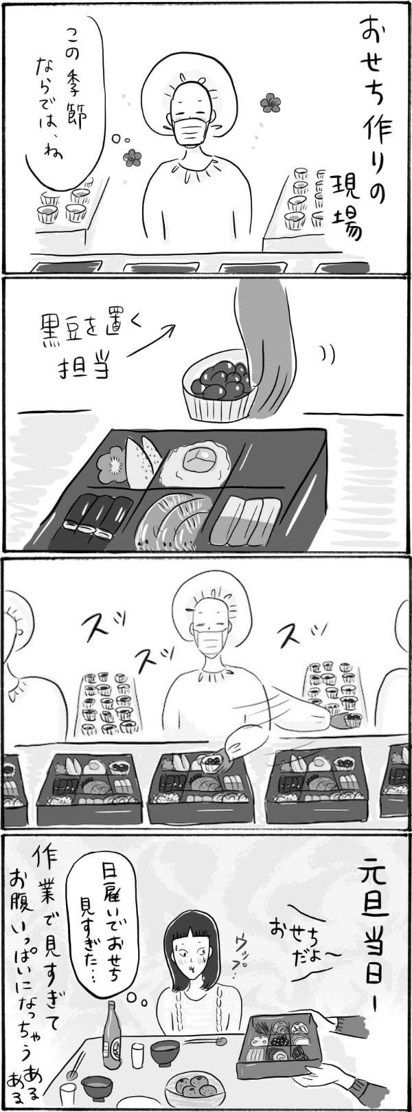 サイゾーウーマンカルチャーマンガ柿ノ種まきこ『アラサー独身女、今日も日雇いで生きてます』【漫画】おせちのトラウマ カルチャー 【連載】柿ノ種まきこ『アラサー独身女、今日も日雇いで生きてます』 【日雇いマンガ】130話『食べてないのに……おせちを見ただけで胸いっぱいになるワケ』 2020/12/17 13:00 柿ノ種まきこ(マンガ家) マンガ柿ノ種まき子日雇い ――「キツイ」「汚い」「男臭い」……なんとなく近寄りがたいイメージのある“日雇労働”。その、実態はどのようなものなのか? 日雇い労働を生業とするアラサー・柿ノ種まきこが、日雇いの日々と人間模様を紹介します。 第130話『食べてないのに……おせちを見ただけで胸いっぱいになるワケ』 ©柿ノ種まきこ 季節感のあるお仕事が多いのも日雇いの面白いところですよね。 年末におせちの現場で流れるおせちを見続けていたら、いざ食べる時になって胸がいっぱいで食べられない……なんてこと、じつは結構あります。 ――毎週、木曜日に最新話を更新。次回131話は12月24日(木)の更新予定です。 柿ノ種まきこ(マンガ家) 日雇いをしながらマンガを描くアラサー。過去には、「iVERY」にて婚活マンガ『女もつらいよ』を連載。現在はインスタグラムにて、マンガを不定期投稿。 Instagram:@kakinotane_makiko LINEスタンプ大好評発売中! 最終更新:2020/12/17 13:00 関連記事 【日雇いマンガ】『アラサー独身女、今日も日雇いで生きてます』【78~84話まとめ読み】【日雇いマンガ】『アラサー独身女、今日も日雇いで生きてます』【85~91話まとめ読み】【日雇いマンガ】『アラサー独身女、今日も日雇いで生きてます』【92~98話まとめ読み】【1~8話まとめ読み】統合失調症にかかりました~にゃんside~【エッセイ漫画】【9~15話まとめ読み】統合失調症にかかりました~にゃんside~【エッセイ漫画】 その他の作品を読むバックナンバーを読む 次の記事 関ジャニ∞・丸山、鈴木拓を泣かせた!? >