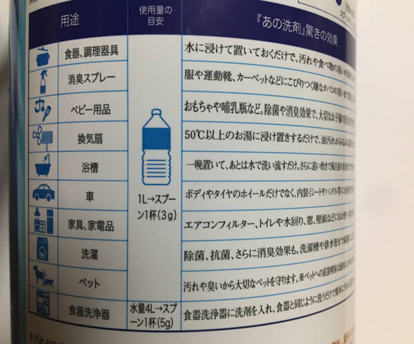 サイゾーウーマン暮らし100均・雑貨「あの洗剤」とオキシクリーン比較レビュー 暮らし トレンド商品ガチレビュー 「あの洗剤」とオキシクリーンの違い、比較レビュー! 焦げつき鍋、醤油・油・口紅の汚れで徹底検証した結果は…… 2021/01/08 15:00 tukki(ライター) トレンド商品ガチレビュー 大ヒットアイテムを実際に使用し、その使い心地を購入者目線でレビューします!今回はSNSで話題のアイテム「あの洗剤」。使い勝手や汚れがどれくらい落ちるのかを検証します。 あの洗剤 価格1790円【ABicom株式会社】 あの洗剤 掃除の面倒なことの一つは、場所に合わせていろいろな洗剤を使い分けるところにありますよね。でも、たった一つ持っていれば、どんな汚れも落とせちゃう、そんな万能な洗剤があるそうなんです! 今回試してみたのは、SNSで話題の商品「あの洗剤」。世界中で3500万本売れており、インスタグラムでも「#あの洗剤」で検索をかけると1,400件以上の投稿が出てきます。1本あれば、家中どこでも掃除できて、除菌・漂白・消臭もできちゃう、とても便利な韓国発の多目的洗剤なんだとか。 公式サイトには、こんな特徴が書かれています。 ■ヤシ油由来の植物性界面活性剤を使用。 ■4つのゼロ(蛍光増白剤・リン酸塩・着色料・水酸化ナトリウム) ■除菌力は99.9%、消臭力も99.6%。 ■韓国のロハス認証も取得、赤ちゃんやこどもの服にも使える。 ■手袋いらず! 皮膚刺激テスト済み。 ■4つの酵素配合で、頑固な汚れも除去。 1)リパーゼ(脂肪分解酵素) 2)プロテアーゼ(タンパク質分解酵素) 3)アミラーゼ(デンプン分解酵素) 4)セルラーゼ(繊維分解酵素) 酵素が入った洗剤は一般的に高価だそうですが、それが4種類も入っています。またコロナ禍の今、除菌力99.9%というのも魅力的ですね。 「あの洗剤」買ってみました! 「あの洗剤」をAmazonにて購入しました。蓋は回して開く形で、中には軽量スプーンがついていました。 あの洗剤は計量スプーン付き(C)サイゾーウーマン サイズは縦15×横9.5㎝。軽量スプーンは5gと1gが計れます。 あの洗剤のラベルに使い方が載っている(C)サイゾーウーマン 裏にいろいろな使い方が載っています。水で薄めれば、消臭スプレーや油汚れを落とすスプレーとしても使えるそうです。 次のページ 「あの洗剤」と「オキシクリーン」を比較! 12345次のページ 関連記事 ワークマン「防風ダブルボアフーディー」検証レビュー! 完売の「伝説アイテム」新作は子育てママに全力でオススメだ【長所・短所】「ぬって焼いたらカレーパン」は高コスパだけど欠点も!? カルディ「パンのお供」人気&新作4選、辛口レビュー!宮崎辛麺、プルダック炒め麺ほか「激辛ラーメン」6種を実食ランキング! 「チーズファンに超絶おすすめ」「辛さマックス」を発表トイレに流せる“挟む生理用品”「シンクロフィット」レビュー! 月経3日目まで使ってみた【長所・短所・注意点】3大ファミレス、モーニングランキング! 第1位ココスの「とても優秀」な715円メニューに迫る