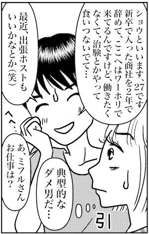 サイゾーウーマンカルチャーマンガ27歳の典型的ダメ男との出会い カルチャー まんが『オバサンと言われても結婚したい!』 【アラフォー婚活ルポ】41歳婚活女、27歳の典型的ダメ男と……この出会いは吉か凶か!? 2021/02/07 13:00 白戸ミフル(マンガ家) オバサンと言われても結婚したい! 日本人だった…ガックリ 次のページ ダメ男だけど、内面が気になる 前のページ123次のページ 関連記事 【アラフォー婚活ルポ】その価値観、わかり合える気がしない! 41歳の婚活にいよいよ不安増大……【アラフォー婚活ルポ】40歳、21歳イケメンとヤッてしまった! このまま終わらせてたまるか~!【アラフォー婚活ルポ】40歳で独身・無職、最高すぎる“婚活方法”発見! 半年後には一発逆転!? 【アラフォー婚活ルポ】39歳でフラれた私は「鬼」になった! 恋愛してやる!! 【アラフォー婚活ルポ】今回の目的はズバリ「告白」! 39歳、上海デートで一大決心 その他の作品を読む
