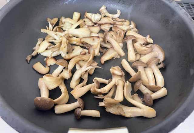 まず、「ホットプレートの空いてるところでキノコ類を炒める」と書いてあったが、今回はフライパンを使うので、先にキノコ類を簡単に炒めました。