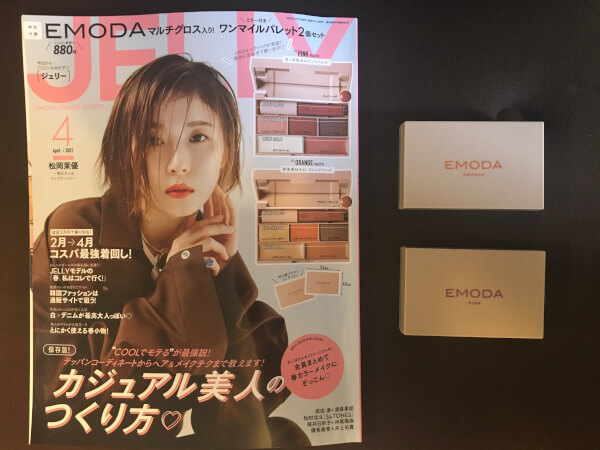 サイゾーウーマン暮らし100均・雑貨「JELLY」4月号付録レビュー 暮らし 【雑誌付録レビュー】 【付録レビュー】「JELLY」4月号、「これで880円は強い」とSNS大絶賛! EMODA6色パレット2個セット、全色試してみた!【女性誌】 2021/02/19 18:18 tukki(ライター) 雑誌付録(ふろく)レビュー いまや付録で雑誌を選ぶのは当たり前。毎月魅力的な付録が登場し、どれにしようか迷いますよね。そこで、付録を実際に手にして、見た目や使い勝手を徹底レビューします! 今月の付録:「JELLY」2021年4月号「EMODAマルチグロス入り!ミラー付き!豪華すぎるワンマイルパレット2個セット 」 お得度:★★★★★(880円でワンマイルパレット2つはお得! グロスも2本付き!) もっと使いたい度:★★★★★(その日の気分やTPOによって選べる2色のパレット♪) おしゃれ度:★★★★★(ピンクもオレンジも使えば今ドキおしゃれ顔に☆) 「JELLY」(文友舎) 2021年4月号 (C)サイゾーウーマン 「JELLY」(文友舎)2021年4月号 の付録は、以下の2点! ・「EMODA マルチグロス入りワンマイルパレット」PINK PALETTE ・「EMODA マルチグロス入りワンマイルパレット」ORANGE PALETTE 今回の付録は、前号同様、女性らしさがありながらも甘すぎないシンプルなデザインが人気のモード系アパレルブランド・EMODAとのコラボアイテム。おうちメイクやワンマイル圏内(ご近所)のお出かけメイクにピッタリな、ミニグロスとアイシャドウ3色、マルチバーム2色入りの鏡付きパレットが2つも付いてくる豪華版です! Twitter上でも、「付録がかわいすぎて買ってしまった♪」「これで880円は強い」「友達とわけあっこしてもよさそう」「旅行や遠征に便利に違いない」と話題になっていました。 早速、詳しく見ていきましょう♪ 「EMODA マルチグロス入りワンマイルパレット」(C)サイゾーウーマン パレットのサイズは、縦6×横9.4×高さ2.1(cm)の持ち歩きしやすいミニサイズ。パッケージにはそれぞれ「EMODA」のブランドロゴとともに「-PINK-」「‐ORANGE‐」と表記されているので、一目でパレットの色味がわかるようになっています。 パッケージの裏面(C)サイゾーウーマン 内容量は以下の通り。どちらのパレットも共通です。 ・マルチグロス 1.3g ・アイシャドウ 1g×3 ・クリームフェイスカラー 1.5g×2 オレンジパレットの中身はこんな感じ(C)サイゾーウーマン 蓋の裏側には大きめの鏡が付いているので、メイクの際に便利ですよ。また、マルチグロスにも「EMODA」のロゴが。グロスはパレットに内蔵できるようになっているので、ひとまとめにして持ち運びすることが可能。これなら鞄やコスメポーチの中で行方不明になることもなさそうです。 ブラシのヘッド部分はこんな感じ(C)サイゾーウーマン 実際に、2つのパレットを全色スウオッチしてみました! 次のページ 2つのワンマイルパレット全12色、スウォッチ&色解説しました! 12次のページ 関連記事 【付録レビュー】「美人百花」 3月号、フェイラーの蓋付き「マルチ収納BOX」が高クオリティで間違いなく買い!【女性誌】【付録レビュー】「InRed」3月号、英国ブランドバッグが大容量で超軽い! 買い物カゴに使えば“袋詰め”のイラつき解放!【女性誌】【付録レビュー】「MonoMax」3月号、「エストネーション」ミニ財布が高級感◎! カード収納たっぷりで機能性もバッチリ【情報誌】【付録レビュー】「MonoMaster」 3月号、「ハミルトン」カードケースは最大31枚収納可! 高級感ある作りに驚き【情報誌】【付録レビュー】「VoCE」3月号は付録で元が取れる!? メイクブラシにクナイプリップほか合計5点で完売続出!【女性誌】