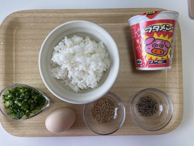 ブタメンをダイソーで買ってきました。卵は卵黄を使う予定です。お好みでゴマと黒胡椒もふりたいので準備。