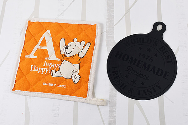 サイゾーウーマン暮らし100均・雑貨デザインと実用性が抜群の“100均鍋敷き対決” 暮らし 【100均ずぼらシュラン】 【ダイソーVSセリア】100均「鍋敷き」対決! 意外と持っていない便利アイテムでお悩みを解決!? 2021/04/01 13:00 ずぼら均子(ライター) ダイソー100均セリア 料理の途中や鍋料理の際などに大活躍してくれる鍋敷き。しかし、新聞や雑誌などその場にあるものでささっと代用してしまう人も少なくないのではないでしょうか? 意外と持っていない人も多い鍋敷きですが、今回はダイソーとセリアから1商品ずつピックアップ。自分に合う商品はどちらか、この機会にぜひチェックしてみてください。 商品を並べたところ(C)サイゾーウーマン プーさんのイラストがかわいい! 「鍋敷き(くまのプーさん)」 便利度:★★★☆☆(ゆとりのあるサイズがうれしい) コスパ:★★★☆☆(ぶ厚い生地は丈夫で破れにくい) キュートさ:★★★★★(プーさんのイラストがかわいい) 商品パッケージ(C)サイゾーウーマン 最初にご紹介するのは、ダイソーの「鍋敷き(くまのプーさん)」。大きさは約20(縦)×20cm(横)で、大きめの鍋でも収まりそうなサイズ感です。 表面にはプーさんのイラストがプリント(C)サイゾーウーマン 同商品の魅力はなんといっても、大きくプリントされた“プーさん”のイラスト。万歳のようなポーズをとっている姿がなんともキュートですね。ディズニー好きの方ならきっと気に入るはず。 鍋を乗せてみたところ(C)サイゾーウーマン 肝心の使い心地を試してみたところ、サイズ感は全く問題なし。一人暮らしからファミリーまで、どの家庭でも活躍してくれそうです。生地にもしっかりした厚みがあり、テーブルに熱が伝わってしまうこともありません。シンプルではありますが、デザインや使いやすさは申し分なしです。 ちなみに同商品は手洗い洗濯を推奨されているので、お手入れの際は注意してくださいね。 次のページ 2WAY使用が便利な「なべ敷き シリコーン レリーフロゴ」(セリア) 12次のページ 関連記事 【ダイソーVSセリア】100均「台所グッズ」対決! 新生活を始める人におすすめのキッチンアイテム収納のプロが選ぶのは、100均・無印・ニトリより「ナカバヤシ」のA4ファイルボックス! 自宅での使用例を公開【ダイソーVSセリア】100均「ウイルス対策グッズ」他全4アイテム【週間まとめ3/22~3/27】【ダイソーVSセリア】100均「ウイルス対策グッズ」対決! メガネ型シールドと抗菌シート、どっちが有効?【ダイソーVSセリア】100均「ブックエンド」対決! インテリアに合わせて選べるデザインで本棚を整頓