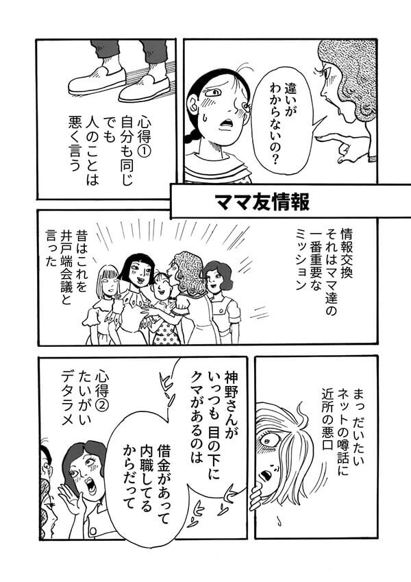 サイゾーウーマンカルチャーマンガマンガ『ママ友はたたりちゃん』#2 カルチャー マンガ『ママ友はたたりちゃん』第1話 デタラメな噂を流された! ママ友の「情報交換」って悪口ばかり?『ママ友はたたりちゃん』#2 2021/05/02 20:00 ウーコミ! マンガウーコミウーコミ!女性コミック あの『不思議のたたりちゃん』がママになって帰ってきた! 舞台は令和、関東某所のマンション住まい。イジメられっ子だった神野多々里も今では男児を育てるママに……。子供の気持ちを誰よりも知るたたりちゃんが、親の悪行に「たたり~」の嵐を巻き起こす! ウーコミ!の人気コミック『ママ友はたたりちゃん~親同士のイジメ・カースト・マウンティング~』、第1話を特別公開いたします。 【前回のあらすじ】 幼稚園の送迎バス。今日から10分早めに集合なんて聞いてない……! ママ友と仲良くなりたいと思っているのに、早々にLINE外しを食らってしまう多々里。それでもめげずにコミュニケーションを取ろうとするけれど……? #2…あの子は駄目でも、私はいいの! 次のページ 幼稚園の情報がほしいのに… 12次のページ 関連記事 「たたりちゃんは私だった」犬木加奈子が回顧する“少女ホラー全盛期”と“いじめの実態”【『サバイバー』インタビュー前編】【実話】お見合い男の「金銭感覚」が異常すぎる!? デート5度目で「マンション購入」に驚愕【実話】結婚するのは「便利だから」!? お見合い5度目のデートで「いいかも」と思った矢先【実話】「エッチな漫画を描いてます」親にも言えないアダルトな職業、婚活デートで明かすのはアリ?【実話】「AV女優に似てるね」空気が読めない34歳の婚活、その顛末は?「お見合い結婚」のリアル その他の作品を読む