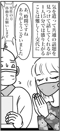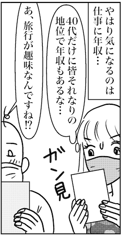 サイゾーウーマンカルチャーマンガこの男性が年収1億円!?!? カルチャー まんが『オバサンと言われても結婚したい!』52話 【アラフォー婚活ルポ】この男性が年収1億円!?!? 40代限定の婚活イベントは「プロフィールカード」に目が釘付け!! 2021/06/12 13:30 白戸ミフル(マンガ家) オバサンと言われても結婚したい! ――合コン歴20年以上、累計回数2,500回以上、30代なかばに乳がんで闘病するも、現在は絶賛婚活中のライター・漫画家の白戸ミフルが「アラフォー婚活」の実体験をお届けします! アラフォー中の結婚は成就するのか……!? 【前回まで】 結婚相談所に入ったものの、リクエストを出した男性全員からNGを出されてしまった私。そこで、結婚相談所の婚活イベントに参加してみることを決意。40代限定のイベントだし、イケメンはいないだろうと思っていたけど、う、嘘でしょ……? こんなオヤジばっかり……!? 今すぐ帰りたい!! でもいっそ、お見合いの練習だと思って積極的にやってやる!! 第52回『この人が年収1億円!?!? 40代限定の婚活イベント、プロフィールカードに目が釘付け!!』 次のページ 年収1億!? 結婚したら良い生活できるんだろうなあ 123次のページ 関連記事 【アラフォー婚活ルポ】う、嘘でしょ……!? 40代限定の婚活イベントで涙!! 今すぐ帰りたい!【アラフォー婚活ルポ】見た目がタイプじゃなくても、会って変わるなんてこと、ホントにあるの?【アラフォー婚活ルポ】初デートに、きっ、着物で登場~!?!? 彼の仕事は……何者?【アラフォー婚活ルポ】やばっ、マルチ勧誘と勘違いされてる!? 楽しいデートが面倒くさい結果に……【アラフォー婚活ルポ】瑛太似のイケメンとデート敢行! 喜んだのも束の間……涙の顛末 その他の作品を読む