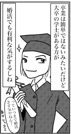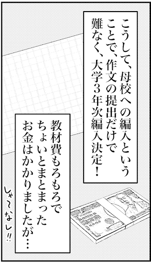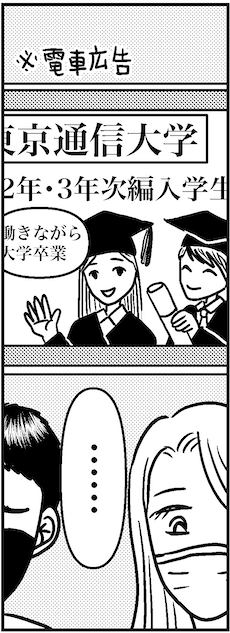 サイゾーウーマンカルチャーマンガ婚活のかたわら、42歳で大学生に カルチャー まんが『オバサンと言われても結婚したい!』54話 【アラフォー婚活ルポ】42歳、婚活のかたわら「美大」入学! あっけなく編入できたワケ 2021/06/21 13:30 サイゾーウーマン編集部(@cyzowoman) オバサンと言われても結婚したい! ――合コン歴20年以上、累計回数2,500回以上、30代なかばに乳がんで闘病するも、現在は絶賛婚活中のライター・漫画家の白戸ミフルが「アラフォー婚活」の実体験をお届けします! アラフォー中の結婚は成就するのか……!? 【前回まで】 結婚相談所に入会した42歳。まずは相談所が主催する40代限定の婚活イベントに参加してみたところ、参加者はオヤジばかりの現実を知ってしまう。もう二度と参加しない! と決意した帰りの電車で、「働きながら大学卒業」の文字を目が発見。大学か……卒業したのは短大だから、ちゃんと勉強し直したい気持ちもあるなあ……。武蔵野美術短大の卒業を利用すれば、ムサビの3年に編入学できたりする? 第54回『42歳、婚活のかたわら「美大」入学! あっけなく編入できたワケ』 次のページ タップルで出会ったイケメン茶道家と2回目デート! 123次のページ 関連記事 【アラフォー婚活ルポ】婚活イベントで質問されたひと言が、頭から離れない……【アラフォー婚活ルポ】この男性が年収1億円!?!? 40代限定の婚活イベントは「プロフィールカード」に目が釘付け!!【アラフォー婚活ルポ】う、嘘でしょ……!? 40代限定の婚活イベントで涙!! 今すぐ帰りたい!【アラフォー婚活ルポ】見た目がタイプじゃなくても、会って変わるなんてこと、ホントにあるの?【アラフォー婚活ルポ】初デートに、きっ、着物で登場~!?!? 彼の仕事は……何者? その他の作品を読む