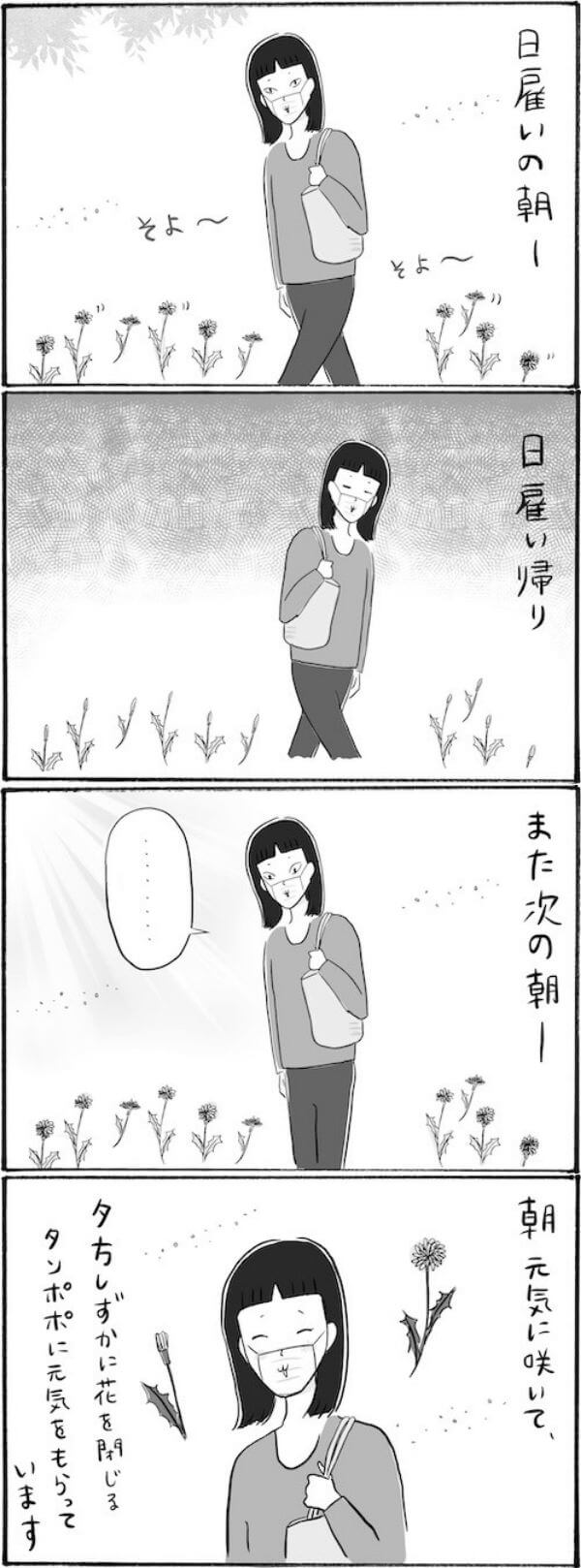 サイゾーウーマンカルチャーマンガ柿ノ種まきこ『アラサー独身女、今日も日雇いで生きてます』【漫画】通勤途中のささやかな幸せ カルチャー 【連載】柿ノ種まきこ『アラサー独身女、今日も日雇いで生きてます』 【日雇いマンガ】157話『元気をチャージ! 仕事の行き帰りに見かけるマル秘アイテム』 2021/06/24 13:00 柿ノ種まきこ(マンガ家) マンガ柿ノ種まき子日雇い ――「キツイ」「汚い」「男臭い」……なんとなく近寄りがたいイメージのある“日雇労働”。その、実態はどのようなものなのか? 日雇い労働を生業とするアラサー・柿ノ種まきこが、日雇いの日々と人間模様を紹介します。 第157話『元気をチャージ! 仕事の行き帰りに見かけるマル秘アイテム』 ©柿ノ種まきこ この季節、朝と夕で違う顔を見せるタンポポになんだか元気をもらっています。 いつもと変わらない毎日でも、草花が季節を感じさせてくれますね〜。 ※漫画内では表現上省略している場面がありますが、作業中はマスクをしています。 ――毎週、木曜日に最新話を更新。次回158話は7月1日(木)の更新予定です。 柿ノ種まきこ(マンガ家) 日雇いをしながらマンガを描くアラサー。過去には、「iVERY」にて婚活マンガ『女もつらいよ』を連載。現在はインスタグラムにて、マンガを不定期投稿。 Instagram:@kakinotane_makiko LINEスタンプ大好評発売中! 最終更新:2021/06/24 13:00 関連記事 【日雇いマンガ】『アラサー独身女、今日も日雇いで生きてます』【8~14話まとめ読み】【日雇いマンガ】『アラサー独身女、今日も日雇いで生きてます』【1~7話まとめ読み】【1~8話まとめ読み】統合失調症にかかりました~にゃんside~【エッセイ漫画】【9~15話まとめ読み】統合失調症にかかりました~にゃんside~【エッセイ漫画】 その他の作品を読むバックナンバーを読む 次の記事 原田龍二「15歳娘と強引にハグ」 >