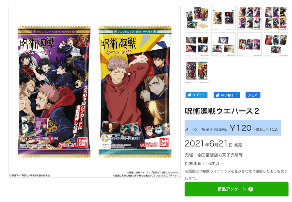サイゾーウーマン暮らし100均・雑貨呪術廻戦、SPカードの確立を検証 暮らし 開封結果を大公開! 「呪術廻戦ウエハース2」箱買いで検証レビュー! SPカードは何枚出るのか試した結果……思わずガッツポーズ展開に! 2021/07/08 17:00 amimeko(ライター) 雑貨 人気漫画やアニメの食玩といえばウエハースが定番化した昨今、トレンドの商品は“売り切れで買えない”なんてことも珍しくありません。そんなおまけ付きウエハースのなかでも人気なのが、アニメ『呪術廻戦』(TBS系ほか)のカード付きウエハース。数カ月前に販売されていた第1弾も売り切れが続出していました。今回、待望の第2弾が発売されたということで、1箱(20個入り)購入し、SPカードが何枚出るか検証します! 「呪術廻戦ウエハース2」とは? 「バンダイ キャンディ」公式サイトより 「呪術廻戦ウエハース2」は、アニメ『呪術廻戦』のカードが付いたウエハースのこと。6月21日に全国量販店のお菓子売り場などで販売が開始されました。価格は1個あたり120円(税込132円)で、ウエハースはバニラクリーム味。封入されているカードは全26種類で、それぞれが豪華両面メタリック仕様となっています。 私は呪術廻戦にドハマリしているので、このカードが欲しくて確実に買える場所を知りたいところですが、公式サイトには「菓子売場等」としか記載がなく、明確な販売店は不明。 ただ、第1弾はコンビニやイオン、ドラッグストア、ドン・キホーテで「買えた」という報告をたくさん見かけたので、近所のコンビニ数件に電話してみたところ、「発売日には店頭に並ぶ予定です」と教えてもらうことができました。 ですが、第1弾では近所のどのお店をまわってもその姿を見かけることはなく、さらにはネット通販の二次販売分でしか購入できず、本当に苦労した私……。念には念をということで、今回は事前にネット予約をすることに。 「呪術廻戦ウエハース2」カードは3種類 「バンダイ キャンディ」公式サイトより 今回の「呪術廻戦ウエハース2」に封入されるカードは全26種類。 ・キャラクターカードR:12種 ・キャラクターカードN:7種 ・スペシャルレアカードSP:7種 なかでも、「スペシャルレアカードSP」は、金色ホロ箔押し仕様の豪華版! 今回は、このSPカードが何枚出るのか検証していきます。ちなみに、第1弾では、購入した1箱のうちSPカードは3枚でした。今回はもっと出てくれるとうれしいのですが……。 第1弾で出たSPカード(C)サイゾーウーマン 次のページ いざ開封! 気になる結果は……? 123次のページ 関連記事 “ネクスト鬼滅”の『呪術廻戦』出演のイケメン声優、榎木淳弥&内田雄馬の気になる業界評を関係者が暴露!「かなりの優等生」「同世代の女性声優と交際」!?【100均レビュー】ダイソーの「カードゲーム」比較! 遊びながら学べて、子どもの知識がグングン増える!100均(セリア)レビュー「ブロック玩具」他全4アイテム【週間まとめ6/28~7/2】安くてうまい肉なら「ジャパンミート」がおすすめ!? 人気スーパー「オーケー」を凌ぐ“お肉の楽園”の魅力とは?スリコ(3COINS)の「珪藻土入りカップインソール」、夏に足元の不快感が気になる人はチェック!