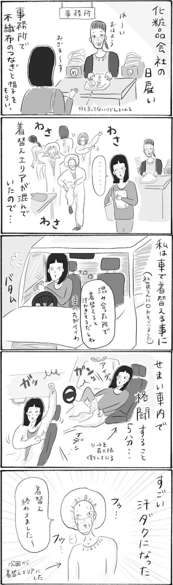 サイゾーウーマンカルチャーマンガ柿ノ種まきこ『アラサー独身女、今日も日雇いで生きてます』【漫画】着替えスペースでの災難 カルチャー 【連載】柿ノ種まきこ『アラサー独身女、今日も日雇いで生きてます』 【日雇いマンガ】163話『車内で大格闘!? 勤務前に汗だくになる珍事件』 2021/08/05 13:00 柿ノ種まきこ(マンガ家) マンガ柿ノ種まき子日雇い ――「キツイ」「汚い」「男臭い」……なんとなく近寄りがたいイメージのある“日雇労働”。その、実態はどのようなものなのか? 日雇い労働を生業とするアラサー・柿ノ種まきこが、日雇いの日々と人間模様を紹介します。 第163話『車内で大格闘!? 勤務前に汗だくになる珍事件』 ©柿ノ種まきこ よかれて思ったことが裏目に出ました……! 作業前に汗ダクになると不快でしょうがないですよね(涙) その後、作業場のクーラーでぶるぶる震えました…。 ※漫画内では表現上省略している場面がありますが、作業中はマスクをしています。 ――毎週、木曜日に最新話を更新。次回164話は8月12日(木)の更新予定です。 柿ノ種まきこ(マンガ家) 日雇いをしながらマンガを描くアラサー。過去には、「iVERY」にて婚活マンガ『女もつらいよ』を連載。現在はインスタグラムにて、マンガを不定期投稿。 Instagram:@kakinotane_makiko LINEスタンプ大好評発売中! 最終更新:2021/08/05 13:00 関連記事 【日雇いマンガ】『アラサー独身女、今日も日雇いで生きてます』【8~14話まとめ読み】【日雇いマンガ】『アラサー独身女、今日も日雇いで生きてます』【1~7話まとめ読み】【1~8話まとめ読み】統合失調症にかかりました~にゃんside~【エッセイ漫画】【9~15話まとめ読み】統合失調症にかかりました~にゃんside~【エッセイ漫画】 その他の作品を読むバックナンバーを読む 次の記事 東原亜希、柔道で“デスブログ”封印!? >