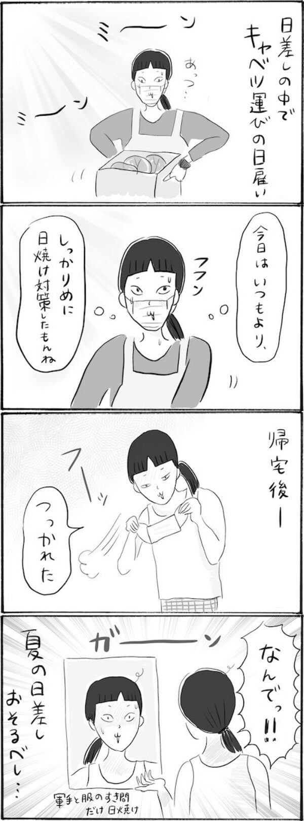 サイゾーウーマンカルチャーマンガ柿ノ種まきこ『アラサー独身女、今日も日雇いで生きてます』【漫画】夏の日雇いで、対策バッチリのハズが…… カルチャー 【連載】柿ノ種まきこ『アラサー独身女、今日も日雇いで生きてます』 【日雇いマンガ】165話『対策バッチリのハズが……トホホな炎天下の日雇いトラブル』 2021/08/19 13:00 柿ノ種まきこ(マンガ家) マンガ柿ノ種まき子日雇い ――「キツイ」「汚い」「男臭い」……なんとなく近寄りがたいイメージのある“日雇労働”。その、実態はどのようなものなのか? 日雇い労働を生業とするアラサー・柿ノ種まきこが、日雇いの日々と人間模様を紹介します。 第165話『対策バッチリのハズが……トホホな炎天下の日雇いトラブル』 ©柿ノ種まきこ ばっちり日焼け止め塗ったから大丈夫! と思いきや、 夏の日差しの強さに完敗のアラサーでした……。 ――毎週、木曜日に最新話を更新。次回166話は8月26日(木)の更新予定です。 柿ノ種まきこ(マンガ家) 日雇いをしながらマンガを描くアラサー。過去には、「iVERY」にて婚活マンガ『女もつらいよ』を連載。現在はインスタグラムにて、マンガを不定期投稿。 Instagram:@kakinotane_makiko LINEスタンプ大好評発売中! 最終更新:2021/08/19 13:00 関連記事 【日雇いマンガ】『アラサー独身女、今日も日雇いで生きてます』【8~14話まとめ読み】【日雇いマンガ】『アラサー独身女、今日も日雇いで生きてます』【1~7話まとめ読み】【1~8話まとめ読み】統合失調症にかかりました~にゃんside~【エッセイ漫画】【9~15話まとめ読み】統合失調症にかかりました~にゃんside~【エッセイ漫画】 その他の作品を読むバックナンバーを読む 次の記事 松居一代、隣家の工事を連日監視! >