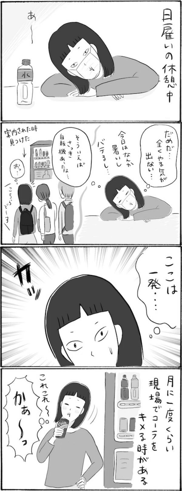 サイゾーウーマンカルチャーマンガ柿ノ種まきこ『アラサー独身女、今日も日雇いで生きてます』【漫画】現場でキマっちゃう秘密の“アレ” カルチャー 【連載】柿ノ種まきこ『アラサー独身女、今日も日雇いで生きてます』 【日雇いマンガ】166話『キターー! 現場でキマっちゃう、とっておきの“アレ”とは……!?』 2021/08/26 13:00 柿ノ種まきこ(マンガ家) 日雇いマンガ柿ノ種まき子 ――「キツイ」「汚い」「男臭い」……なんとなく近寄りがたいイメージのある“日雇労働”。その、実態はどのようなものなのか? 日雇い労働を生業とするアラサー・柿ノ種まきこが、日雇いの日々と人間模様を紹介します。 第166話『キターー! 現場でキマっちゃう、とっておきの“アレ”とは……!?』 ©柿ノ種まきこ 自販機が無い現場もあるので、飲み物は必ず持参しています。自販機がある現場で、やる気が出ない時には炭酸を飲んで『っかぁ〜!!』っとやる気を出しています。冬はあったかい缶コーヒーもいいですね。 ――毎週、木曜日に最新話を更新。次回167話は9月2日(木)の更新予定です。 柿ノ種まきこ(マンガ家) 日雇いをしながらマンガを描くアラサー。過去には、「iVERY」にて婚活マンガ『女もつらいよ』を連載。現在はインスタグラムにて、マンガを不定期投稿。 Instagram:@kakinotane_makiko LINEスタンプ大好評発売中! 最終更新:2021/08/27 13:54 関連記事 【日雇いマンガ】『アラサー独身女、今日も日雇いで生きてます』【8~14話まとめ読み】【日雇いマンガ】『アラサー独身女、今日も日雇いで生きてます』【1~7話まとめ読み】【1~8話まとめ読み】統合失調症にかかりました~にゃんside~【エッセイ漫画】【9~15話まとめ読み】統合失調症にかかりました~にゃんside~【エッセイ漫画】 その他の作品を読むバックナンバーを読む 次の記事 GACKTも体調不良、芸能人の健康問題 >
