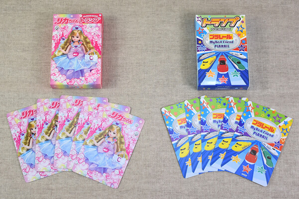 サイゾーウーマン暮らし100均・雑貨大人気おもちゃがダイソーのトランプに!? 暮らし 【100均ずぼらシュラン】 【100均レビュー】ダイソー「トランプ」比較! プラレール&リカちゃんのデザインで楽しさアップ!? 2021/08/26 13:00 ずぼら均子(ライター) ダイソー100均 「プラレール」と「リカちゃん」といえば、子どもが喜ぶおもちゃの2大巨頭。アイテムにイラストや写真があしらわれているだけでも、とてもうれしかったですよね。実は100円ショップで販売されている“トランプ”にも、プラレールやリカちゃんの描かれている商品があることは知っていますか? 商品を並べたところ(C)サイゾーウーマン さまざまな角度から車両を観察できるダイソーの「プラレール トランプ」 便利度:★★★★☆(いつものトランプよりテンションアップ!) コスパ:★★★★★(カード1枚1枚が丈夫なのもGOOD) デザイン:★★★★★(車両の種類が複数あるのもうれしい♪) 商品パッケージ(C)サイゾーウーマン まず紹介するのは、タカラトミーから発売されている大人気鉄道おもちゃ「プラレール」がデザインされたトランプ。すべてのカードに、少しだけデフォルメされた車両のイラストが描かれています。 トランプを並べたところ(C)サイゾーウーマン マークによって車両の種類が異なっており、例えばハートマークのカードには真っ赤なカラーリングが特徴の新幹線・こまちのイラストが。ほかにもクローバーは新幹線・はやぶさ、スペードには新幹線・のぞみで知られるN700A、ダイヤには黄色の車両が目印の検査用車両・ドクターイエローが描かれていました。 トランプを並べたところ(C)サイゾーウーマン 数字カードはいろいろな角度から見た車両のイラストとなっており、それぞれの車両の形の違いを学べるのも魅力。カッコいい車両の数々に、トランプで遊びながらもテンションが上がってしまいそうですね。 次のページ 「リカちゃん トランプ」でリカちゃんのお友達も覚えられるかも!? 12次のページ 関連記事 【100均レビュー】ダイソー「変わり種バルーン」比較! 膨らませると胸をくすぐるかわいいデザインに100均(ダイソー)レビュー「マグネット付きキッチングッズ」他全6アイテム【週間まとめ8/9~8/20】【100均レビュー】ダイソー「キッチングッズ」マグネットで貼れるので、パっと使えて料理をお助け!【100均レビュー】ダイソー「キッチン用品お手入れグッズ」比較! 力を入れなくても手軽にピカピカ!【100均レビュー】ダイソー「クセになる手触りグッズ」比較! 気持ちよすぎて手放せない!?