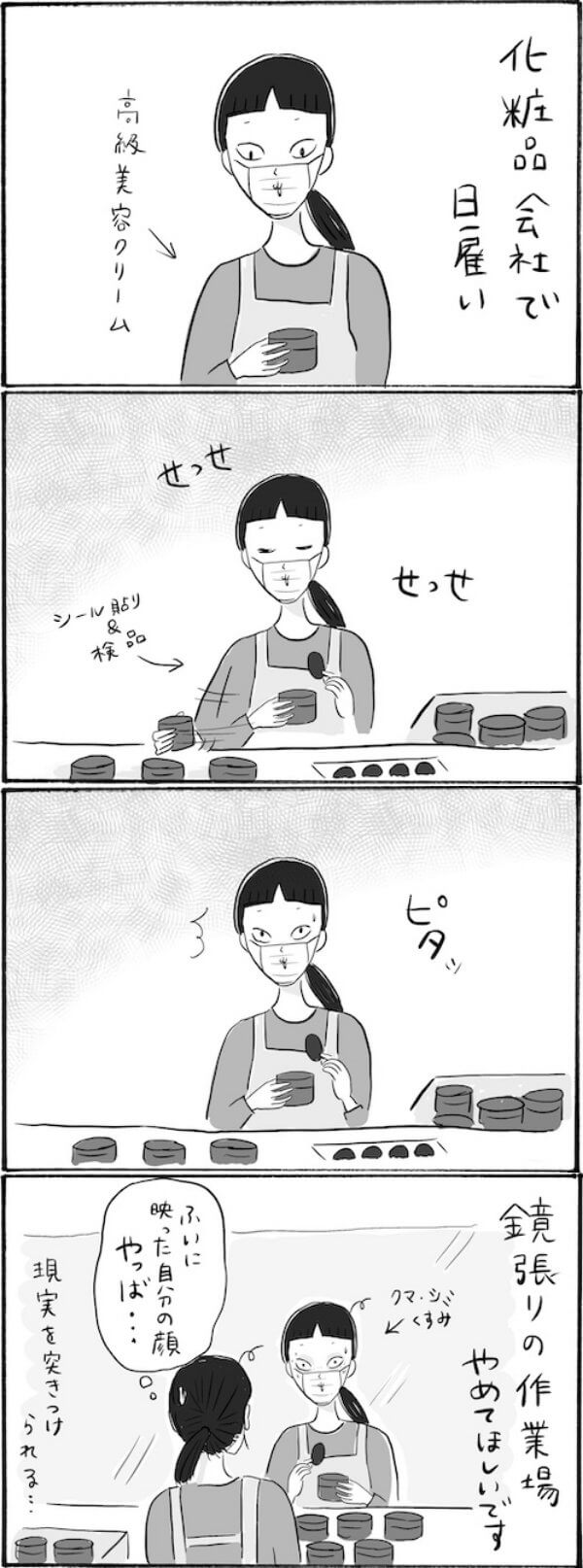 サイゾーウーマンカルチャーマンガ柿ノ種まきこ『アラサー独身女、今日も日雇いで生きてます』【漫画】鏡にうつる化物の正体とは カルチャー 【連載】柿ノ種まきこ『アラサー独身女、今日も日雇いで生きてます』 【日雇いマンガ】170話『ドキッ!! 作業没頭中ふと我に返って、残酷な現実に震える瞬間』 2021/09/23 13:00 柿ノ種まきこ(マンガ家) マンガ柿ノ種まき子日雇い ――「キツイ」「汚い」「男臭い」……なんとなく近寄りがたいイメージのある“日雇労働”。その、実態はどのようなものなのか? 日雇い労働を生業とするアラサー・柿ノ種まきこが、日雇いの日々と人間模様を紹介します。 第170話『ドキッ!! 作業没頭中ふと我に返って、残酷な現実に震える瞬間』 ©柿ノ種まきこ 化粧品会社での日雇い。会社の方針なのか、鏡がたくさんある現場で自分の美意識が試される〜! シミソバカスだらけの顔で撃沈しました……(涙) ――毎週、木曜日に最新話を更新。次回171話は9月30日(木)の更新予定です。 柿ノ種まきこ(マンガ家) 日雇いをしながらマンガを描くアラサー。過去には、「iVERY」にて婚活マンガ『女もつらいよ』を連載。現在はインスタグラムにて、マンガを不定期投稿。 Instagram:@kakinotane_makiko LINEスタンプ大好評発売中! 最終更新:2021/09/23 13:00 関連記事 【日雇いマンガ】『アラサー独身女、今日も日雇いで生きてます』【8~14話まとめ読み】【日雇いマンガ】『アラサー独身女、今日も日雇いで生きてます』【1~7話まとめ読み】【1~8話まとめ読み】統合失調症にかかりました~にゃんside~【エッセイ漫画】【9~15話まとめ読み】統合失調症にかかりました~にゃんside~【エッセイ漫画】 その他の作品を読むバックナンバーを読む 次の記事 キンプリ・平野、自宅で魚をさばく >