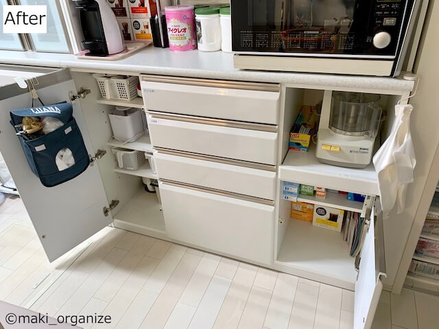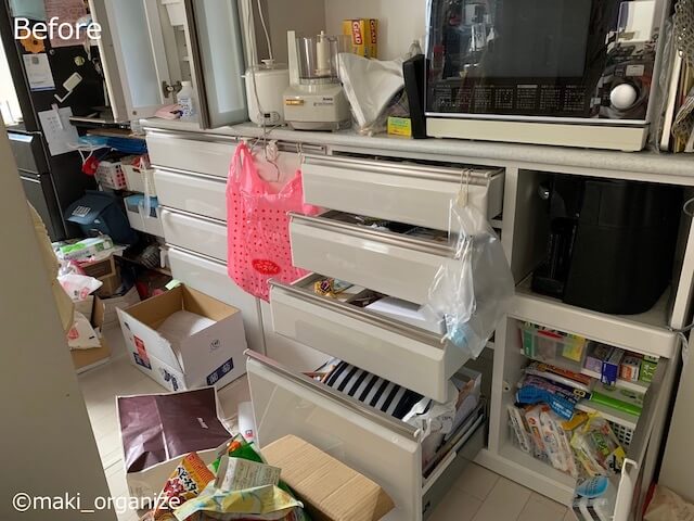 サイゾーウーマン暮らし住まいキッチン引き出し収納、片付けテク12 暮らし [連載]30代女子の「煩悩部屋」ビフォーアフター キッチン「引き出し収納」劇的ビフォーアフター12連発! 整理収納のプロが手直しすると、どう変わる? 2021/10/11 19:30 伊藤まき(収納ライター) 「汚部屋」ビフォーアフター [Before.12]床にあふれたモノ 収納する場所がない困った道具の山たち(C)maki_organize 赤ちゃんが歩きはじめる前に、手に届くモノは全部なくしたいとKさん。キャビネットを開けるにも、モノを動かす面倒がありました。 [After.12]床上に置くモノは、稼働できる荷台へセット 掃除機がけも、簡単になりました(C)maki_organize モノを減らして、収納を全部見直したことで「床置き」するモノがすべて消えました。また、重たい宅配水のストックは、可動できるようにキャスター付き荷台へ。写真の、コーナン「インテリアベース」1,078円(税込、ライター調べ)は、安くておすすめです。 最後に改めて、全体のBefore→After写真を比較してみましょう! まとめ[Before]キッチンの作業がやりにくかった引き出し やる気を奪う引き出し(C)maki_organize 引き出しを開けるだけでもレジ袋や床上のモノが邪魔をしています。カウンターの上もゴチャゴチャで、何をするにも「どかす作業」が必要でした。 まとめ[After]家事の効率がアップする余白が多い収納に 見違える美しさ!(C)maki_organize キッチンボードの中身を全部見直したことにより、「収納のゆとり」が生まれました。床に置くモノがなくなったので、扉の開閉もスムーズです。すべて「モノの住所」を用意したので、散らかっても片付けのゴールが見えるので大丈夫です。 次回は、キッチンボード上の食器棚をすっきり! 前のページ12345 伊藤まき(収納ライター) 収納ライター・兼・整理収納アドバイザー1級。クリンネスト2級。おがくず工場に生まれ、ホテル清掃員、国鉄系レストランの厨房、内装会社、デパートの搬入搬出など“家事の土台”を極めた生活を経て、出版社入社ののち独立、現在に至る。モノを手放すほど「幸運」が舞い込むジンクスを何度も体感! 貧乏神と決別した実体験をもって、整理収納の威力をお伝えします。 記事一覧 Instagram:@maki_organize 最終更新:2021/10/13 15:24 うちの引き出しか? って既視感しかないわ 関連記事 ワッツ「のせのせストッカー」で激安スッキリ! 棚のデッドスペース、仕切りがない空間を100均で解決荒れ果てて見るのもつらいダイニングテーブル周り、劇的スッキリ! ビフォーアフターと6つの解決策IKEA大人気「3段ワゴン」のNG収納例!? “ゴチャゴチャ”ラックをプロが正しくお片付け! 大小2種類も使用比較7年放置で苔、サビ、ヌメリびっしり! “害虫の家”化した汚ベランダが美しくチェンジ、衝撃のビフォーアフターダイソーのアレを切るだけ、200円で完成! フィギュアや小さなおもちゃの「大量ディスプレイ収納」でスッキリ解決 次の記事 ポルノ、パパ活報道が炎上してないワケ >