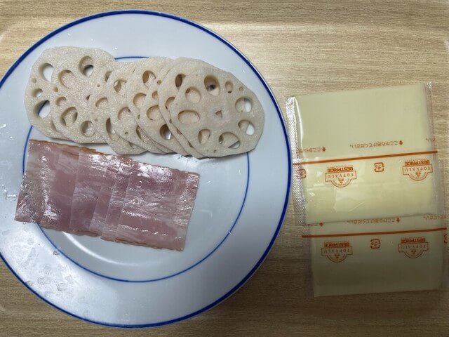 2)れんこんにチーズ、ベーコン、チーズの順に挟む。(写真よりチーズ多めがお勧めです)