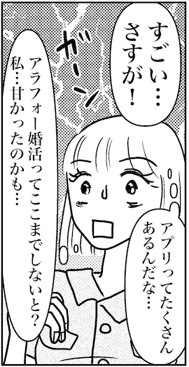 サイゾーウーマンカルチャーマンガアラフォー婚活こんなにやらないといけないの⁉︎ カルチャー まんが『オバサンと言われても結婚したい!』79話 【アラフォー婚活ルポ】アラフォー婚活ってここまでしないと? 私、甘かった…… 2021/11/03 13:30 白戸ミフル(マンガ家) オバサンと言われても結婚したい! ――合コン歴20年以上、累計回数2,500回以上、30代なかばに乳がんで闘病するも、現在は絶賛婚活中のライター・漫画家の白戸ミフルが「アラフォー婚活」の実体験をほぼリアルタイムでお届けします! アラフォー中の結婚は成就するのか……!? 【前回まで】 タップルで出会った彼と、結婚前提の交際をしていたけど正味2カ月で破局。また婚活を再開したけど、アプリでは負け続き。そんな中、同じく婚活中の読者と会って、情報交換することに。 79話『アラフォー婚活ってここまでしないと? 私、甘かった……』 次のページ 若い男子はいい! 123次のページ 関連記事 【アラフォー婚活ルポ】43歳、現実と向き合う日々に“希望の光”が? 【アラフォー婚活ルポ】3日後は43歳の誕生日! しかも祝日、予定なし!【アラフォー婚活ルポ】42歳、結婚前提の彼と破局! また婚活再開しなきゃ……【アラフォー婚活ルポ】結婚できそうだから選んだだけ? 彼のこと、本当に好きなのかな……【アラフォー婚活ルポ】「2カ月だけ時間をくれる!?」涙目の彼の訴えに、関係やり直し決定? その他の作品を読む