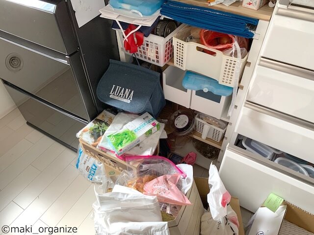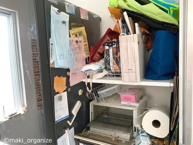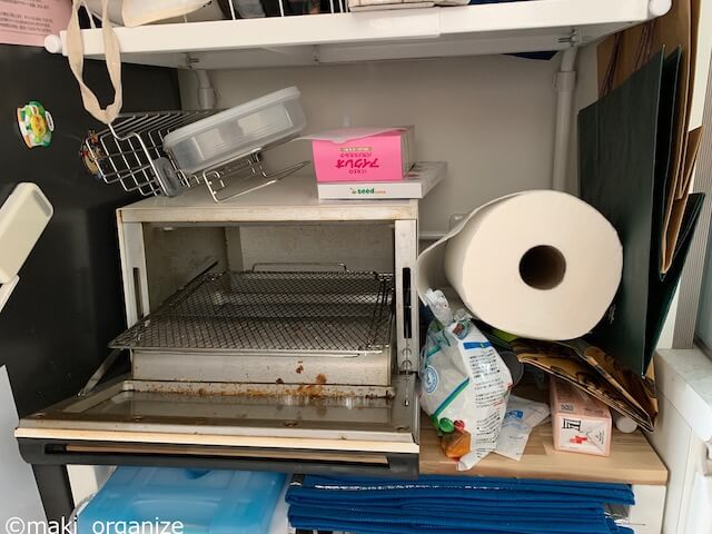 サイゾーウーマン暮らし住まいダイソーで「キッチンラック」が激変 暮らし [連載]30代女子の「煩悩部屋」ビフォーアフター ダイソーのコレが救世主! 使いにくい「トースターラック」が収納力アップ、機能的にスッキリ激変 2021/11/15 19:30 伊藤まき(収納ライター) 「汚部屋」ビフォーアフター 連載企画「30代女子の「煩悩部屋」ビフォー・アフター」の新シーズンが始まりました。今回は、汚部屋あらため「汚家(おうち)」をまるごと片付けます! クライアントは板橋区・3SLDKの一軒家に家族4人で暮らす兼業主婦のKさん(37歳)です。 お悩み:「キッチンラックが使いにくい」板橋区・Kさん(37歳/会社員役職) ラックの上部(C)maki_organize 汚家まるごと変身企画“27回目”は、「キッチンラック」。冷蔵庫の横にある「木製のキッチンラック」が問題の場所で、上の写真はラック上部です。 ラックの下部(C)maki_organize ラックの空間にトースター、ゴミ箱などを置きたいものの、うまく使えないとお悩みのKさん。ラックを買い換えずに、低予算で「使える収納」に変更します! 解決策はダイソーの「ジョイントラック」。予算2,000円で、機能的になった「キッチンラック」をビフォーアフターで紹介していきます。まずは、「使いにくい原因」と「改善したい内容」をまとめます。 [上段 Before]追加した電子レンジ用ラックが失敗のもと トースター上に燃えやすいモノを置くのは危険!(C)maki_organize トースター上の空間も使いたいと、ラックの上にさらに「電子レンジ用ラック」を設置したのが失敗でした。トースター周りの隙間にモノを詰め込みすぎて、火が出たこともあったそう……。今、見てもヒヤヒヤです。 ★Kさんが改善したい内容 [1]低予算で「トースターラック」を買い替えたい [2]放熱できる余裕をキープしたい [3]キッチンペーパーの定位置を作りたい 紙袋のストックは、キッチンにいらない(C)maki_organize 手を上に上げる高さに「片手で出し入れできないモノ」「出し入れのアクション数が多い収納箱」を置くと、散らかりやすくなります。最初は整っても、続かない収納になりやすいので注意! ★Kさんが改善したい内容 [1]快適な出し入れで「収納力」を増やしたい [2]賞味期限の早い食品を置く場所がほしい [3]冷蔵庫のマグネットボードを、活用したい [検証]モノをゼロにして、サイズ感を確認する すぐ買わずに、テープで空間を区切って考えて!(C)maki_organize 「中途半端な余白」が散らかる原因になりがちです。そのため「電子レンジ用ラック」はフリマアプリで転売を決意。 代わりに用意したい「トースターラック」のサイズ感を、マスキングテープを貼ってシュミレーション。すぐ買わずに、数パターンの候補を検討します。 次のページ [使用アイテム]ダイソーの「ジョイントラック」 123次のページ 関連記事 食器棚の「○○ケース」をなくして、収納力アップ! 家事効率がグングン上がるビフォー・アフター実例集キッチン「引き出し収納」劇的ビフォーアフター12連発! 整理収納のプロが手直しすると、どう変わる?ニトリ・無印良品・100均よりコスパ最強な理由! プロが選ぶ【コーナン】5段ケースで、キッチンクローゼットがスッキリワッツ「のせのせストッカー」で激安スッキリ! 棚のデッドスペース、仕切りがない空間を100均で解決IKEA大人気「3段ワゴン」のNG収納例!? “ゴチャゴチャ”ラックをプロが正しくお片付け! 大小2種類も使用比較