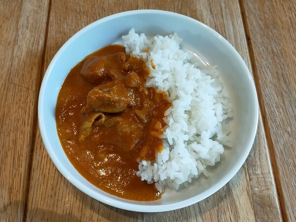 ナンでもいただきます。クセもなく、ごはんでもナンでもバランス良く合います。辛さはあまりなく、子どももパクパク食べていました。個人的には甘みが強すぎると感じました。本場の、というより日本人の好みに合わせ、万人受けを狙ったバターチキンカレーといったところでしょうか。