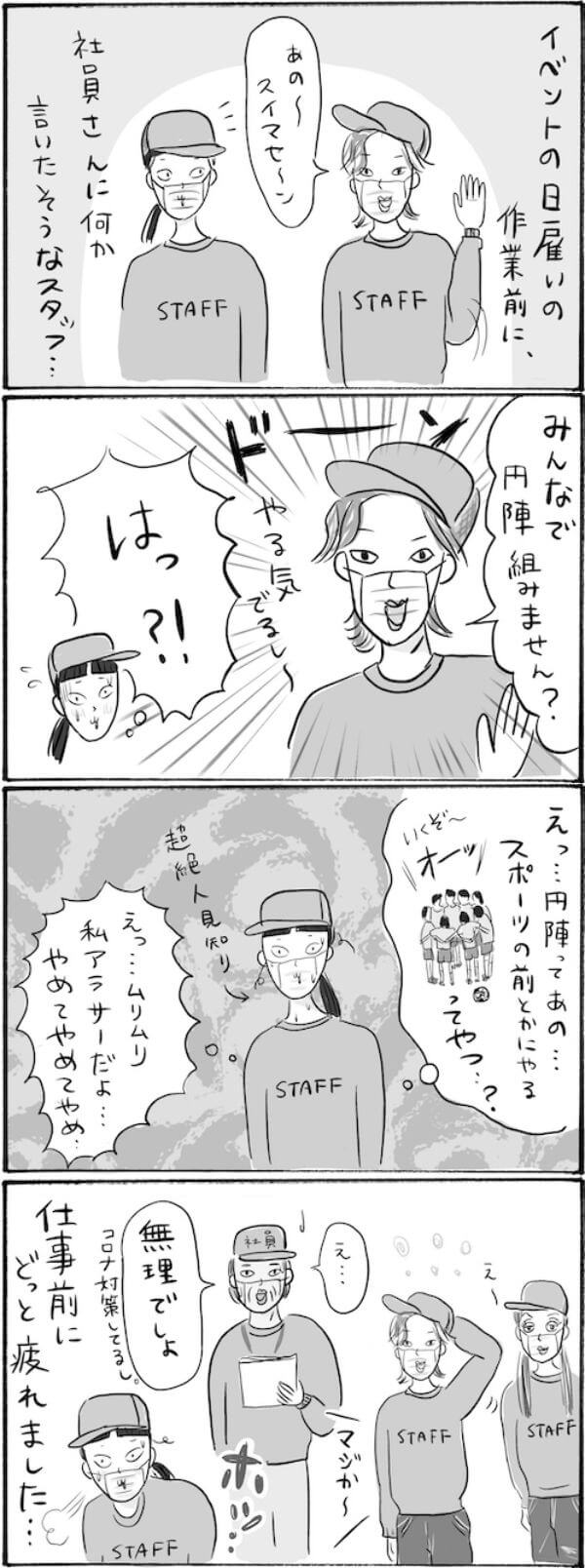サイゾーウーマンカルチャーマンガ柿ノ種まきこ『アラサー独身女、今日も日雇いで生きてます』【漫画】キラキラ男子のトンデモ提案 カルチャー 【連載】柿ノ種まきこ『アラサー独身女、今日も日雇いで生きてます』 【日雇いマンガ】180話『キビシー!! 人見知りには不向きな超絶キラキラ現場~後編~』 2021/12/02 13:00 柿ノ種まきこ(マンガ家) 日雇いマンガ柿ノ種まき子 ――「キツイ」「汚い」「男臭い」……なんとなく近寄りがたいイメージのある“日雇労働”。その、実態はどのようなものなのか? 日雇い労働を生業とするアラサー・柿ノ種まきこが、日雇いの日々と人間模様を紹介します。 第180話『キビシー!! 人見知りには不向きな超絶キラキラ現場~後編~』 前編はこちらから ©柿ノ種まきこ 若いキラキラ日雇い男子が、作業前に円陣を組んで気合いを入れようという提案。人見知りアラサーにはかなりきついっす。若い子達で盛り上がっていましたが、社員さんの一言で一蹴。命拾いしました……。 ――毎週、木曜日に最新話を更新。次回181話は12月9日(木)の更新予定です。 柿ノ種まきこ(マンガ家) 日雇いをしながらマンガを描くアラサー。過去には、「iVERY」にて婚活マンガ『女もつらいよ』を連載。現在はインスタグラムにて、マンガを不定期投稿。 Instagram:@kakinotane_makiko LINEスタンプ大好評発売中! 最終更新:2021/12/02 13:00 関連記事 【日雇いマンガ】『アラサー独身女、今日も日雇いで生きてます』【8~14話まとめ読み】【日雇いマンガ】『アラサー独身女、今日も日雇いで生きてます』【1~7話まとめ読み】【1~8話まとめ読み】統合失調症にかかりました~にゃんside~【エッセイ漫画】【9~15話まとめ読み】統合失調症にかかりました~にゃんside~【エッセイ漫画】 その他の作品を読むバックナンバーを読む 次の記事 芸能人のペット事情 >
