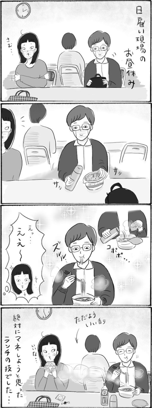 サイゾーウーマンカルチャーマンガ柿ノ種まきこ『アラサー独身女、今日も日雇いで生きてます』【漫画】お手軽冬の神ランチ カルチャー 【連載】柿ノ種まきこ『アラサー独身女、今日も日雇いで生きてます』 【日雇いマンガ】182話『その手があったか!! 真冬に絶対に試したい神ランチ』 2021/12/16 13:00 柿ノ種まきこ(マンガ家) マンガ柿ノ種まき子日雇い ――「キツイ」「汚い」「男臭い」……なんとなく近寄りがたいイメージのある“日雇労働”。その、実態はどのようなものなのか? 日雇い労働を生業とするアラサー・柿ノ種まきこが、日雇いの日々と人間模様を紹介します。 第182話『その手があったか!! 真冬に絶対に試したい神ランチ』 ©柿ノ種まきこ 寒い休憩室に漂うカップラーメンのいい香り……。お湯がない現場も多いので諦めていた汁系ランチですが、お湯入り水筒持参の技を目撃して次は絶対真似しようと誓いました。 ――毎週、木曜日に最新話を更新。次回183話は12月23日(木)の更新予定です。 柿ノ種まきこ(マンガ家) 日雇いをしながらマンガを描くアラサー。過去には、「iVERY」にて婚活マンガ『女もつらいよ』を連載。現在はインスタグラムにて、マンガを不定期投稿。 Instagram:@kakinotane_makiko LINEスタンプ大好評発売中! 最終更新:2021/12/16 13:00 関連記事 【日雇いマンガ】『アラサー独身女、今日も日雇いで生きてます』【8~14話まとめ読み】【日雇いマンガ】『アラサー独身女、今日も日雇いで生きてます』【1~7話まとめ読み】【1~8話まとめ読み】統合失調症にかかりました~にゃんside~【エッセイ漫画】【9~15話まとめ読み】統合失調症にかかりました~にゃんside~【エッセイ漫画】 その他の作品を読むバックナンバーを読む 次の記事 新庄剛志「整形やりどきよ」 >
