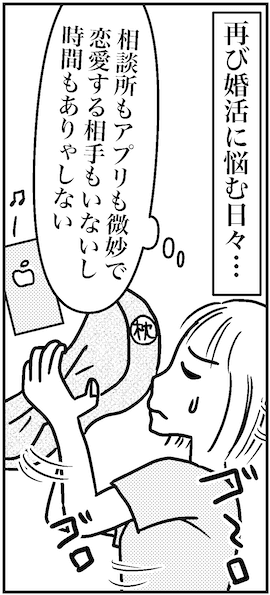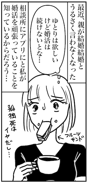サイゾーウーマンカルチャーマンガ電撃入籍した友人から「別居」報告! カルチャー まんが『オバサンと言われても結婚したい!』94話 【アラフォー婚活ルポ】ナンパで出会った男と電撃入籍した友人から「別居した」報告! 2021/12/29 13:30 白戸ミフル(マンガ家) オバサンと言われても結婚したい! ――合コン歴20年以上、累計回数2,500回以上、30代なかばに乳がんで闘病するも、現在は絶賛婚活中のライター・漫画家の白戸ミフルが「アラフォー婚活」の実体験をほぼリアルタイムでお届けします! アラフォー中の結婚は成就するのか……!? 【前回まで】 20代の男の子と遊んだあと、めっきり婚活が進まなくなった私。結婚相談所もアプリも続けているけど、大学も忙しいし時間が足りない。そんな中、久しぶりに母親とお出かけすることに。もう母親も74歳かあ。そりゃあ私も43歳になるわけだよね……。そういえば、最近は親が「結婚結婚」言わなくなった気がする。 93話「ナンパで出会った男と電撃入籍した友人から「別居した」報告!』 次のページ 旦那の稼ぎが悪いと言っていたけど…… 123次のページ 関連記事 【アラフォー婚活ルポ】結婚相談所は進まない、アプリも失敗続き。なにやってるんだろう、私?【アラフォー婚活ルポ】相手のマンションは◎◎!? 泊まり覚悟も『絶対ヤバい!』と我に返ったワケ【アラフォー婚活ルポ】23歳男子とうっかり泥酔した結果……お泊まりコース!?【アラフォー婚活ルポ】「うちに来ませんか?」23歳男子から終電前のお誘い! 43歳、どうする?【アラフォー婚活ルポ】アラフォー婚活ってここまでしないと? 私、甘かった…… その他の作品を読む
