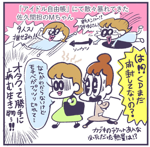 サイゾーウーマンカルチャーマンガ【マンガ】Snow Manのデビュー後「初」有観客コンサート参戦! 阿部亮平には“ペンライト問題”の弊害も!? カルチャー えるたまのアイドル自由帳 第75回 【マンガ】Snow Manのデビュー後「初」有観客コンサート参戦! 阿部亮平には“ペンライト問題”の弊害も!? 2022/01/04 19:00 えるたま(マンガ家) えるたまのアイドル自由帳 ――マンガ家・えるたまが、パロディとリスペクトでアイドルたちをいじくり愛でる! 男女問わずアイドルと呼ばれるすべての“煌めき”たちに捧ぎます……。 ※これまでのバックナンバーはこちら! Snow Manのデビュー後初の有観客ライブへ! まさかの”神席”に大興奮 次のページ Snow Man・佐久間大介担、他界寸前も“ファンサ”で復活! 1234次のページ 関連記事 【マンガ】King&Princeのコンサートは「70点」!? 歌、ダンス、ファンサに大興奮も「器用貧乏」グループになりそうな懸念がチラリ【マンガ】なにわ男子、デビュー発表公演に行ってきた! 「なにわの日」関ジャニ∞・大倉忠義の“粋な演出”に最高の大号泣【マンガ】ジャニーズJr.「IMPACTors」は、K-POP好きとKAT-TUN担に刺さる!? 生みの親・タッキーにデビューを懇願したくなった初単独ライブを振り返る【マンガ】新婚で“帰宅恐怖症”に陥った夫――「あなたのため」という妻の”偽善”に、夫の本音は【マンガ】「新婚1年でセックスレス」の責任はどこにある? ”勃たない夫”、妻側の視点は その他の作品を読む