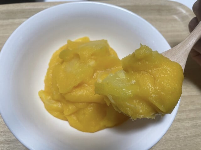 本来ならば、マーガリンを使わないといけないレシピですが、バターのコクがねっとりとした芋に絡み合ってバッチリマッチしています。バター臭さもなく、ほのかなバター風味。裏ごしした滑らかな芋だけを食べてみると、甘さが足りない気がしましたが、パイナップルを噛んだ瞬間に口の中でジュワーと甘酸っぱさが広がります。