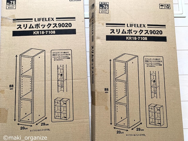 右はカラボの「オリジナル スリムボックス 6020」。冷蔵庫サイドに使った棚(9020)より高さが低い型です。棚板1枚は冷蔵庫サイドで使っています。
