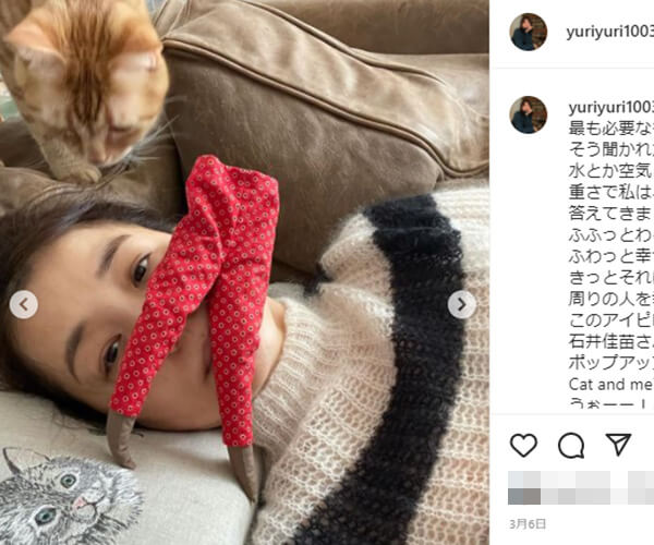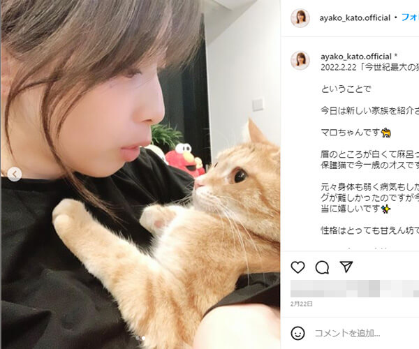 サイゾーウーマン芸能アナウンサー加藤綾子が「新しい家族」紹介 芸能 インスタグラムからよりどり 加藤綾子が「新しい家族」紹介、石田ゆり子がユーモア語る、仲里依紗は猫に跨る?【芸能人の愛猫8連発】 2022/03/22 15:00 サイゾーウーマン編集部 男性タレント芸能ウラ情報女性タレント 日々、人気芸能人のプライベートを覗き見ることができるインスタグラム。家族の一員であるペットとのショットを公開している人も大勢見られます。そこで、今回は猫との微笑ましい8枚を紹介! 加藤綾子インスタグラムより■加藤綾子 昨年6月に一般男性と結婚したフリーアナウンサーの加藤綾子は、2月22日の“猫の日”に「今日は新しい家族を紹介させて下さい!! マロちゃんです 眉のところが白くて麻呂っぽいのでマロちゃんとつけました 保護猫で今一歳のオスです!」と新入りを紹介。愛猫を愛おしそうに見つめる加藤の表情に、「猫愛があふれてます」「マロちゃん素敵な家族と出会えて良かったですね」などのコメントが寄せられています。 石田ゆり子インスタグラムより■石田ゆり子 動物好きで知られる女優の石田ゆり子は、「人が生きていくために最も必要なものはなにか。そう聞かれたら水とか空気とかと同じくらいの重さで私は、ユーモア、と答えてきました」とつづり、愛猫とのショットを公開。ちなみに、石田の顔に乗っているのは、女性の脚を模したアイピローだそう。この写真のほかにも、愛犬の顔にこのアイピローを乗せたファニーなカットも投稿しています。 中尾明慶インスタグラムより■中尾明慶 俳優の中尾明慶は、愛猫・おかかと添い寝する姿を公開。2015年8月に保護団体から引き取ったおかかですが、この日は「40代くらいの女子と添い寝をしてしまいました」とつづっていました。中尾のYouTubeチャンネル「中尾明慶のきつねさーん」にも登場するおかかは、ファンにはすっかりお馴染みの存在となっているようです。 仲里依紗インスタグラムより■仲里依紗 そんな中尾の妻で女優の仲里依紗は1月19日、虎柄のヘアバンド姿でおかかにまたがった写真を投稿。『もののけ姫』ならぬ「またたび姫」と名付けられたこのコラージュは、「この画像深夜3時に飛び起きて作ったよ」とのこと。コメント欄には「ジブリ感あって好きです」「ブラックなおかかさま」「ツボすぎて笑えます」などの声が集まっていました。 misonoインスタグラムより■misono 動物愛護を念頭に置いた発信を続けている歌手のmisonoは、保護猫の譲渡会場でパシャリ。こちらはmisonoの飼い猫ではなく、保護猫のバンビちゃんだそうです。ちなみに、misonoのYouTubeチャンネルでもこの譲渡会の様子が配信されていて、動物好きの視聴者から注目されています。 恒松祐里インスタグラムより■恒松祐里 猫好きを公言する女優の恒松祐里は、昨年11月に愛猫・チャーリーの8歳の誕生日を祝福する投稿をしていました。しかし、今月9日には「我が家の愛猫チャーリーが息を引き取りました」と報告。原因は「大きな病院で検査したところリンパ腫と診断されました」とのことで、「今までチャーリーを可愛がってくれた皆様。本当にありがとうございました。幸せな8年だったと思います」と感謝の思いをつづっています。 葉月里緒奈インスタグラムより■葉月里緒奈 「自撮りをしていたらベアに見られてた」とつづり、ロシアンブルーのベアとの写真を公開したのは、女優の葉月里緒奈。「#視線を感じると思ったら #換気扇の上から呆れ顔で見ていた」とのハッシュタグも添えており、ファンから「里緒菜さん、めっちゃ美人。かわいい猫ちゃんとのコラボは最高です」「ベアちゃん抱っこの写真なんて……もう、お二人共かわいすぎて」と称賛コメントが寄せられています。 土屋アンナインスタグラムより■土屋アンナ 大の猫好きで知られるタレントの土屋アンナは、アメリカンカールのはなちゃんとのツーショットを公開。ファンから「同じ眼をしてるね!」「顔、似てますね」という指摘が相次いでいます。 サイゾーウーマン編集部 芸能・ジャニーズ・美容・暮らし・カルチャーなど、さまざまな情報を独自の切り口で発信するニュースサイト X:@CyzowomanC Instagram:@cyzowoman オンナを刺激するニュースブログ[サイゾーウーマン] 最終更新:2022/03/22 15:00 癒やされる~ 関連記事 赤西仁の寝起き画像に「朝から幸せ」、BTS・Vは「眠い」、ザギトワは「美しすぎる」と反響【有名人の寝ぐせ姿7連発】杉浦太陽は「だいすき」、吉田沙保里の友チョコ、久慈暁子は地割れ、小林麻耶は謎バッグ!?【芸能人のバレンタイン8連発】中谷美紀はオーストリアでコロナ太り阻止、桃井かおりはLAで牡蠣、諸星和己はハワイで新事業【芸能人の海外生活8連発】ジャニーズ時代の川崎麻世はキンプリ・高橋海人似!? 氷川きよしは「バイトしてた」【懐かしの新成人写真8連発】元アジアン・隅田美保の近影に「LiSAみたい」反響、伊勢谷友介は「撃沈」、後藤祐樹は……【芸能
