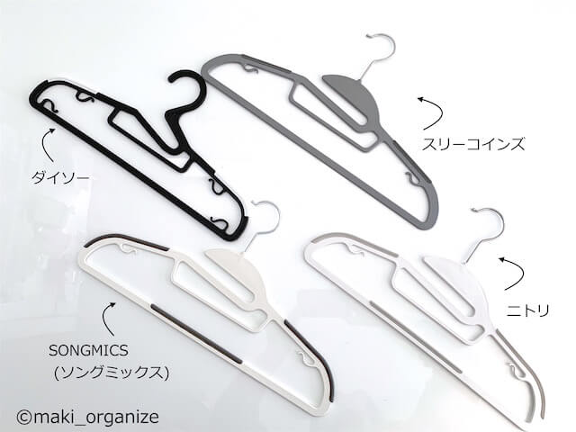 サイゾーウーマン暮らし住まいダイソー・ニトリ他「進化系ハンガー」比較 暮らし 伊藤まきの「お片付けSOS」相談! 「ニトリ」のハンガーなら洗濯物は「畳まない」でOK! 収納のプロがダイソー・スリコ他6種と比較レビュー! 2022/04/26 20:30 伊藤まき(収納ライター) 「お片付け・お掃除SOS」伊藤まき どれを選ぶ? 微妙に違う「進化系ハンガー」の選び方! プラスチック製のハンガーの場合(C)maki_organize 今回検証したのは、[1]ダイソー[2]スリーコインズ[3]ニトリ[4]SONGMICS (ソングミックス) の商品です。すべて、滑り止めが付いています。さらに、ファストファッションに多いハンガーループ(細い紐)付きで、スカーフなど服装小物を掛けられるようにデザインされています。 この中から筆者が選ぶのは、ニトリとソングミックスです。 安心の「ニトリ」と、 amazonの「ソングミックス」がおすすめ! フックが360度回転すれば、掛ける場所も自由(C)maki_organize 筆者が片付けに用意するのは、ニトリ「すべりにくい省スペースハンガー レディースサイズ」or ソングミックス「型崩れしない Tシャツハンガー」です。ハンガーを選ぶ際にチェックしている10のポイントもクリアしています。 さらに、1本ずつ詳しくチェックしてみましょう! ニトリ「すべりにくい省スペースハンガー レディース」5本セット 5本304円/1本あたり60,8円/40本で2,432円(すべて税込)(C)maki_organize ニトリのハンガーは、5本単位で買い足しできる点が◎。比較した4種の中で、最もハンガーのフック(首)が長いので、ポールに掛けやすくなります。フックが長いほど、クローゼット内の洋服が見えやすくなるのでスッキリ効果も上がります。 次のページ ソングミックス「型崩れしない Tシャツハンガー」20本セット 前のページ1234次のページ 関連記事 ダイソー品切れ大ヒット「ワンプッシュ保存容器」、収納のプロがカインズ・ニトリと徹底比較ジャッジ!ダイソー・無印良品と比較して決定! 収納のプロが、3COINS(スリーコインズ)「クリアボックス」を指名買いのワケ5年分のホコリが積もった「カーテン」、カビの根が生えた「窓枠サッシ」……汚部屋をプロが大掃除してみた!プロに学んだ大人気「ウタマロクリーナー」の5つの使い方! オキシクリーンも重曹もいらない大掃除テクニックを伝授ダイソーなら予算10分の1でOK!? 収納のプロが体当たりレポート、「魔法のテープ」不要でここまでできる